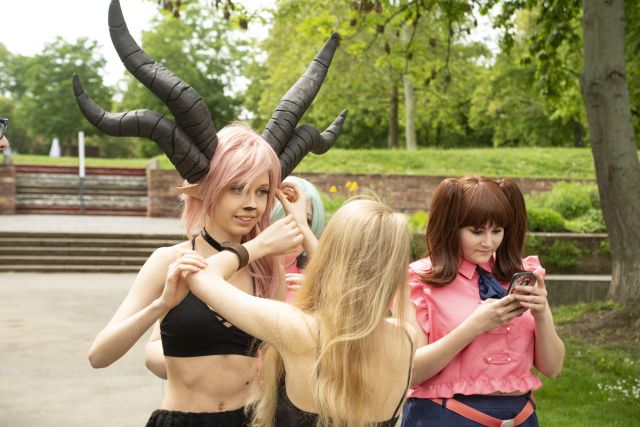 Die Gruppe setzt sich für ein Gruppenfoto in Bewegung; für manche eine Herausforderung: „Typische Cosplayer- Probleme: Man kann nicht laufen, man kann nicht aufs Klo…“ Besonders eingeschränkt ist ein pinkhaariges Mädel mit beeindruckendem Geweih auf dem Kopf und noch beeindruckenderen Schuhen: Ein selbstgebautes Plateau in Paarhuf-Form und abgesägter Absatz ergeben ein tierisches Schuhwerk, in dem man sich ohne Assistenz nur schwer bewegen kann. Die Zwillinge Sarah und Lea kommen immer gemeinsam und immer als OCs (Own Characters); sie imitieren keine vorhandenen Figuren, sondern denken sich eigene Kostüme aus, die trotzdem dem Manga-/ Anime-Stil entsprechen. Sarah gefallen insbesondere apokalyptische Szenarien, für die sie „steampunkige“ kämpferische Kleidung mit ganz viel angebrachter Eisenware herstellt. Lea erscheint immer als minotaurisches Zwitterwesen. Schuhe und Hose bleiben stets gleich, aber Hörner und Accessoires variieren. Das hört sich arbeitsökonomisch an, aber an den Hörnern hat sie mit ihrer Schwester acht Stunden geschnitzt. Insgesamt 20 Stunden braucht sie für ein Komplettkostüm. Hufe und Hörner bestehen aus Styrodur und dem „Cosplayer- Gold“ Worbla, einem thermoplastischen Kunststoff-Holz-Gemisch. Ich fragte eine gelbhaarige Crossplayerin (als Crossplay bezeichnet man, wenn man eine Figur darstellt, die eine andere Geschlechtsidentität als man selbst hat), wen sie darstellt. „Das ist eine laaange Geschichte…. Ich bin eigentlich tausende von Jahren alt und besitze eine Taverne…“ Es folgen konkrete Schilderungen von Vorgängen aus einer mir fremden Welt, bis sie von ihrer türkishaarigen Nachbarin unterbrochen wird. „Ich glaube sie wollte nicht die gesamte Geschichte deines Charas hören. Also wir alle sind Charaktere aus Seven Deadly Sins; wir kämpfen gegen Dämonen und wollen einfach die Welt retten, vor den Hauptbösewichten, den 10 Geboten. Wir sind Meliodas, Elizabeth und Diane; eigentlich haben wir noch ein Wildschwein als Begleiter.“ Alles klar. Warum sie gerade diese Charaktere verkörpern? „Momentan machen wir, was wir feiern und lieben. Mal ist man gerne ein Weib mit kurzem Rock, mal ein Mann mit flacher Brust.“