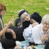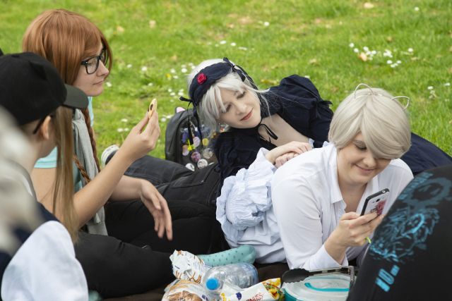 Wir warten mit den Maja-Pan-Organisatorinnen an der Bushaltestelle am Volkspark auf kostümierte Menschen. „Für meine Oma ist das wie Fastnacht.“, sagt Mit-Organisatorin Kati, die aussieht wie Waisenjunge Ray. Tatsächlich sind die Kostüme aber oft zu filigran für die Straßenfastnacht. Gleich trudeln weitere Verkleidete ein. „Victor?!? Hätte ich das gewusst, hätte ich Yuri angezogen!“. Alle begrüßen sich fröhlich bis hysterisch – manchmal würden angesichts eines Cosplay die Gefühle mit einem durchgehen – und eine illustre Truppe setzt sich in Richtung Wiese in Bewegung. Auf der Wiese werden Picknickdecken und Verpflegung ausgebreitet und man beginnt zu fachsimpeln: „Für welchen Charakter ist die denn?“, wird eine gefragt, die an einer bunten Perücke herumschneidert. Nebenan: „Wie hast du die Augenbrauen hingekriegt?“ – „Pritt-Stift und Foundation. Viel, viel Foundation.“. Das Cosplay zum Eiskunstläufer Victor wird wiederholt erkannt und freudig begrüßt. Ich bestaune derweil Kekse in der Form von Panda-Gesichtern. Ab und an kurvt eine Bimmelbahn vorbei. Die Insassen betrachten die Gruppe teils belustigt, teils verdutzt. Manche winken fröhlich, die bunten Menschen winken zurück. 20 Cosplayer sind schon eine Attraktion in Mainz: „Wir hatten hier mal eine Yoga-Gruppe und die hat sich von uns gestört gefühlt.“, sagt Kati, beziehungsweise Ray. Die Yogis hätten sich auffallend nah neben den Maja- Pans niedergelassen und dann später beim Aufbruch gestänkert: „Wir seien ja ernstlich unerwachsen und würden Drogen nehmen. Und dann noch dieser Lärm.“ Hört sich ein bisschen an wie aus einem Song einer deutschen Punk-Band. „Dabei haben wir nur gegessen, gesungen, was wir immer so machen.“ – „Ich habe ja schon oft unausgeglichene Yoga-Leute getroffen.“, meint ein anderer.