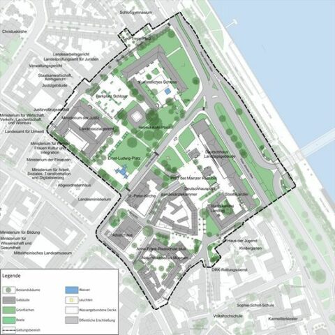 Das Mainzer „Regierungsviertel“ – aktuell der Bereich zwischen Rhein, Schloss, Landtag bis zum Allianzhaus und dem Brunnen auf dem Ernst-Ludwig-Platz – soll neu gedacht werden. Schon seit Jahrhunderten wurde das Viertel immer wieder umgestaltet – nun ist (dank Biontech- Corona-Steuern und dem Umzug des Römisch- Germanischen Zentralmuseums) die Möglichkeit wieder einmal da – auch die Große Bleiche könnte an dieser Stelle für den Verkehr geschlossen werden.