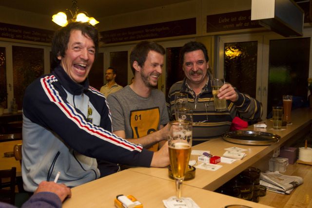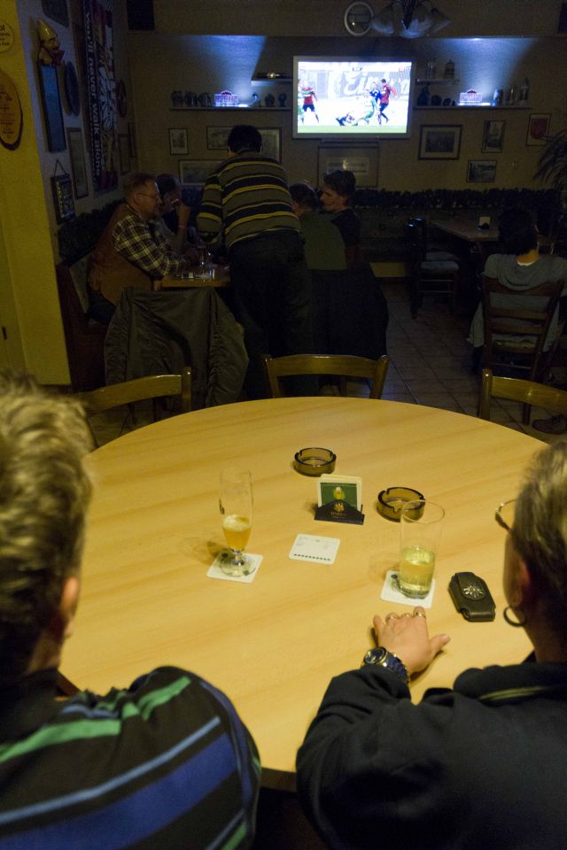 Für besondere Geburtstage und Betriebsfeiern bietet der Kneipenhorst immer noch Kneipen-Touren an. Wenn auf einmal 50 bis 60 Gäste vor der Tür stehen, kommen die Wirte schnell ins Schwimmen. „Dann muss einer der Gäste mal ein, zwei Stunden mitzapfen“, sagt Marc. Im Kleinen Andechs ist man viele Gäste gewohnt, die Tester können gerade noch den letzten freien Platz ergattern. Zum Fußball gucken sind hier die wenigsten. Die kleinen Fernseher rauschen im Hintergrund. Die Speisekarte wurde mit Tipp-Ex verkleinert: „Ein markantes Bild der neuen Rauchergesetze“, sagt Daniel. Rindswurst mit Brot und Senf (4 €), Spundekäs´ (4 €) und die orientalische Delikatesse Humus (5 € sind geblieben. Fazit: Die beste Wahl, wenn Fußball nicht die Hauptsache ist. Hier wird noch bis spät in die Nacht Bier ausgeschenkt.