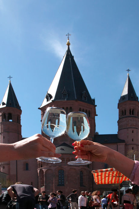 Wir starten unseren Schorlenspaziergang auf dem Markt, genauer auf dem Liebfrauenplatz mit dem traditionellen Mainzer Marktfrühstück. Neben dem Stück Fleischworscht gehört hier auf jeden Fall auch ein „Schoppe“, wie die Schorle in Mainz eigenannt wird, dazu. Der Verein der Mainzer Winzer betreibt hier einen Stand, den jeden Samstag ein anderer Winzer bestückt. Bei unserem Test war es das Weingut von Helmut Eckert aus Mainz-Ebersheim. Die fleißigen und sehr freundlichen Helfer benutzen Eifelquelle zum Mischen der Schorle. Bestellt man hier eine einfache Weinschorle wird die mit Silvaner serviert. Die Schorle ist sehr mild und sprudelig und lässt sich süffig trinken. Die Rieslingschorle ist allein in ihrer Farbe schon viel kräftiger. Sie ist etwas trockener und auch der Säuregehalt ist höher. Dafür hat sie mehr „Schmackes“ und ist intensiver im Geschmack. Auf dem Markt herrscht an einem solch sonnigen Samstag buntes Treiben. Das Publikum ist gemischt und man freut sich beim Plausch auf dem Markt. Leider gibt es wenig Tische und Bänke. Kleiner Tipp hier: Gegenüber vor dem Gutenberg Museum stehen aus Beton gegossene Lettern, die sich wunderbar als Tisch eignen. Gegen 14 Uhr ist Schluss auf dem Markt und dann auch mit dem Wein. Sonne gibt es hier aber die ganze Zeit satt. Qualität und Ambiente sind hier top. Und auch das Preisleistungsverhältnis kann sich sehen lassen: Eine große Weinschorle kostet 2,40 Euro.