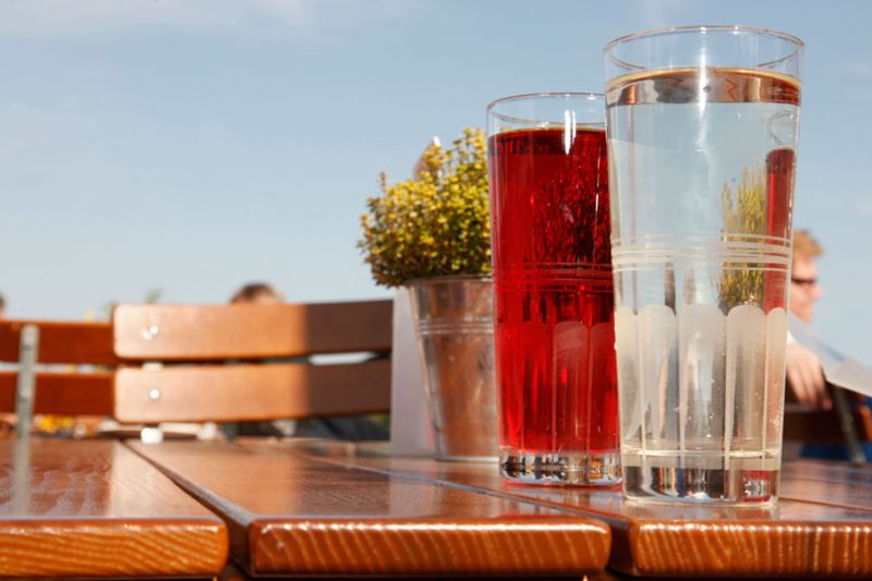 Zum Abschluss eines sonnigen Samstags darf in Mainz natürlich der Gang zum Rhein nicht fehlen. Unsere letzte Station ist der Biegarten L`Arcade auf der Mole im Winterhafen. Im Angebot hat der Biergarten „Echt Meenz“: Rieslingschorle, Laugenbrezel und Spundekäs für 5,50 €. Neben der Weinschorle, die auch hier einzig mit Riesling gemischt angeboten wird, gibt es auf der Mole auch eine hervorragende Roséschorle. Der Preis von 3,50 Euro ist durchaus angemessen. Die Rieslingschorle ist fruchtig, erfrischend und etwas süßer als die bisher getesteten. Die Roséschorle hat wenig Kohlensäure, aber dennoch viel Pfiff und schmeckt sehr lecker. Zum Mischen wird Evian-Wasser verwendet. An der Mole kommt richtig Urlaubsatmosphäre auf: Die Sonne scheint den ganzen Tag, vom Wasser zieht etwas Frische herauf, die Schiffe auf dem Rhein lassen einen geradezu romantisch werden. Schatten spenden nur Bäume und Schirme und die angenehme Musik im Hintergrund sorgt zusätzlich dafür, dass wir die Mole als perfekten Ort bewerten, um den Schorlen-Samstag ausklingen zu lassen. Nachahmern der Schorlen-Tour sei noch eins dringend ans Herz gelegt: Am Ende eines solchen Ausflugs sollte jeder mit dem Taxi oder mit dem Nahverkehr nach Hause fahren!