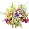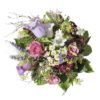 Wir bekommen einen richtig großen Strauß aus „typischem Sommerflor“ und einer Pfingstrose, der von einem Kranz aus Zweigen gestützt wird. Er ist recht hoch und tendenziell rund gebunden. Wer es unkompliziert mag, wird hier gerne hingehen. Außerdem gibt es auch schon für kleineres Geld recht große Sträuße.