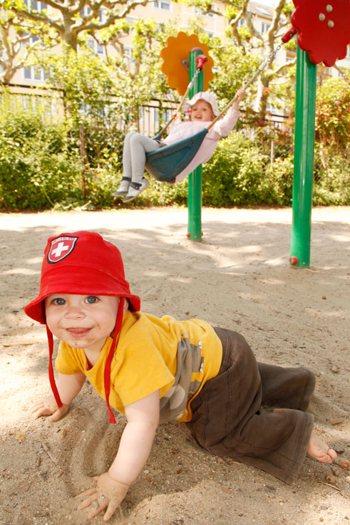 Dass Spielplatz-Konzepte nicht immer funktionieren, veranschaulicht die Anlage in der Badergasse. Die Künstlerin Birgit Kratzheller hat die sorgfältig gepflasterte Hügellandschaft Ende der 90er Jahre konzipiert, die durch kleine Sichtbetonmauern und riesige, hölzerne Waschzuber strukturiert ist. Als Kunstobjekt Sinn machend – als Spielplatz jedoch kaum genutzt. Im Sommer soll eine Pumpe den Platz in ein Plantsch-Paradies verwandeln. „Sie ist aber oft kaputt“, erklärt Susanne Schenkel, Mutter eines zweijährigen Sohnes. „Und wenn sie funktioniert, fließt das Wasser nicht richtig ab. Dann ist es auf den Steinen so glitschig, dass die Kinder dauernd hinfallen und sich die nackten Knie aufschlagen. Außerdem rennen die Kleinen in der prallen Sonne herum, denn das darunterliegende Parkhaus verhindert eine Bepflanzung der Fläche mit Bäumen. Nur die wenigen Sitzbänke stehen unter einer Pergola.“ Die anwesenden Altstadt-Mütter urteilen unisono: Bei der vorherrschenden Enge in der Altstadt ist es sehr schade, dass dieser Platz nicht kindgerechter gestaltet wurde.