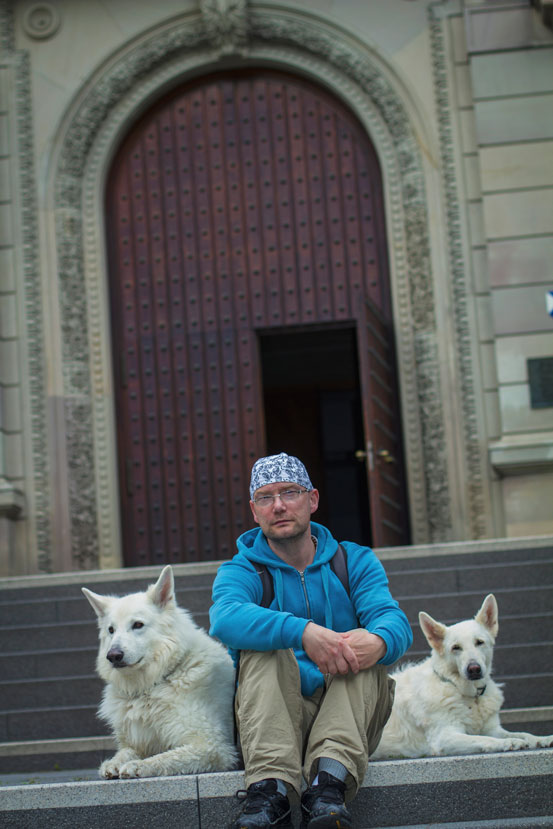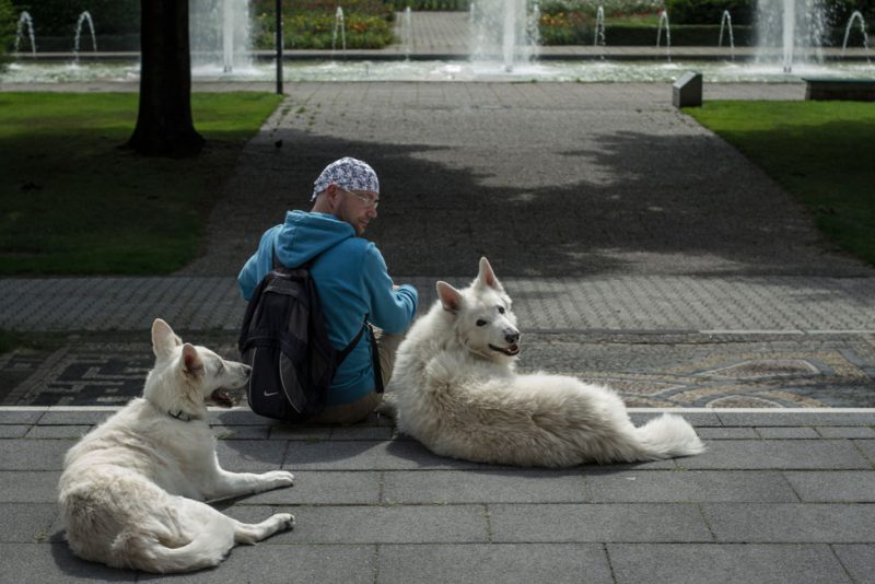 Gemächlich folgt Akito nun also alleine seinem Mixtur aus Polarwolf und Schäferhund Herrchen oder bleibt gelassen stehen, wenn Detlef mal wieder neugierigen Passanten Rede und Antwort steht. Ein wenig wundert es ihn dabei schon, dass trotz der Größe der Hunde kaum jemand Berührungsängste zeigt. „Vor schwarzen Hunden haben die Leute meistens Angst, aber mit der schneeweißen Farbe ihres Fells verbindet man wohl eher etwas Friedliches wie Himmel oder Engel.“ Auf seinen Spaziergängen knüpft er daher immer wieder Kontakte: „Da gibt es schöne, aber auch weniger schöne Begegnungen.“ So haben Diwa und Akito schon bei einem Fotoshooting eines Hochzeitspaares als „Brautjungfern“ agiert. Andererseits fühlt sich manch ein Hundebesitzer provoziert, wenn er die großen Weißen nicht an der Leine führt. Ob man dem eingespielten Team auch in Zukunft im Stadtzentrum begegnen wird, ist noch ungewiss. Seit kurzem ist Detlef auf der Suche nach einer neuen Bleibe für sich und seine „Familie“ – mit Platz für zwei Hunde – denn auf jeden Fall möchte er sich nach einer angemessenen Trauerphase wieder einen zweiten weißen Hund anschaffen. Am Goetheplatz will er dann nicht mehr länger bleiben. Die zunehmende „Ghettoisierung“ dort störe ihn.