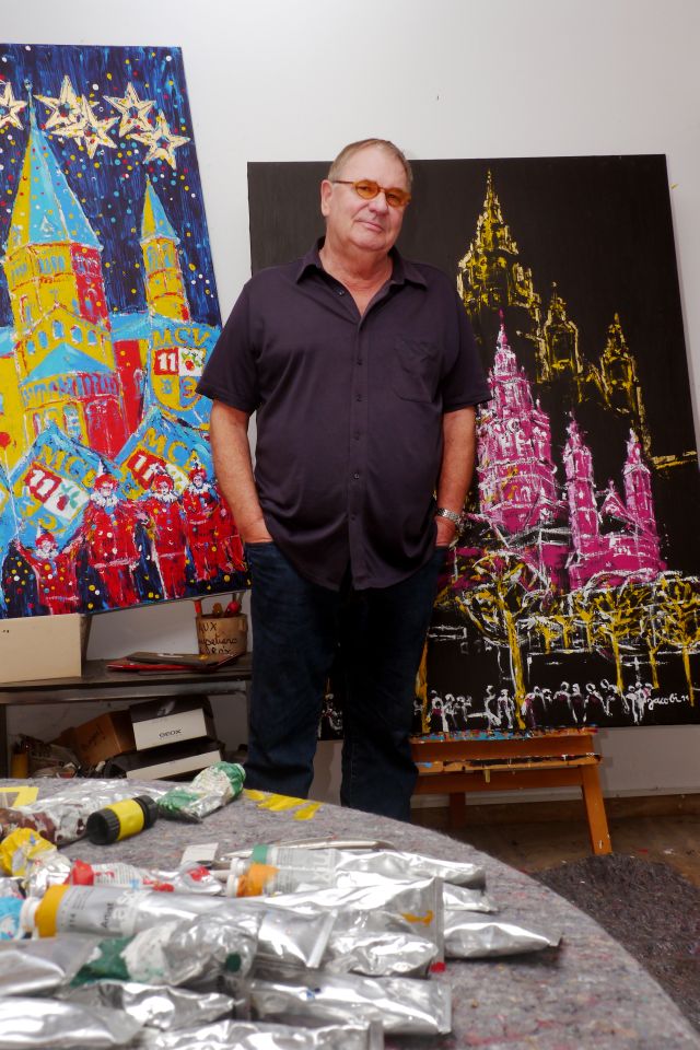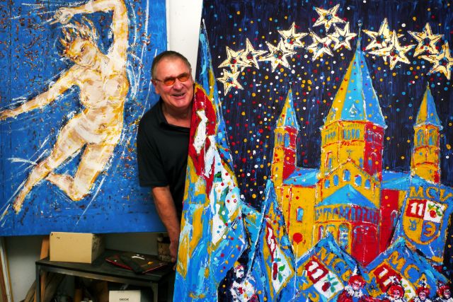 Von außen wirkt das Domizil oberhalb des Rosengartens am Volkspark eher unscheinbar. Doch die mannshohe antike Germania-Statue vor dem Eingang lässt eine vage Ahnung aufkeimen, was uns im Inneren des Hauses erwartet. Dann öffnet Hans- Jörg Jacobi die Tür und wir treten ein in ein Reich von antiken Kostbarkeiten, Farbtuben, Gemälden, Leinwänden und Kuriosem wie einer (Teddy-)Bärensammlung – in ein Reich von Sagen und Legenden. Und schnell wird klar: Das „bunte“ Ambiente ist ein Spiegelbild des schillernden Bewohners, der sich auch noch in höherem Alter mit ungebremster Energie einer ganzen Palette an Interessen widmet und nebenbei als Multitalent entpuppt. Da gibt es zum einen Hans-Jörg Jacobi, den „Mainzmaler“ mit stadtbekannten Motiven. Gerade arbeitet der Ex-Stadtarchitekt und -Stadtbildpfleger an einem neuen Bilderzyklus zum Thema „Geheimnis Dom“, dem er sich aus Sicht des Malers nähern möchte. „Fühlbilder“ nennt Jacobi die aktuell entstehenden Werke. Um eine besondere Stimmung zu erzeugen oder ein bestimmtes Gefühl wiederzugeben, hat er 23-karätiges Blattgold verwendet. Das bringt eines seiner Lieblingsmotive zum Strahlen, den Mainzer Dom, oder die Sterne am Himmel über dem Fanfarenzug des Mainzer Carnevalsverein MCV.