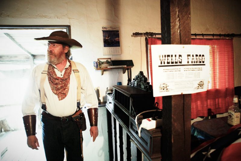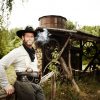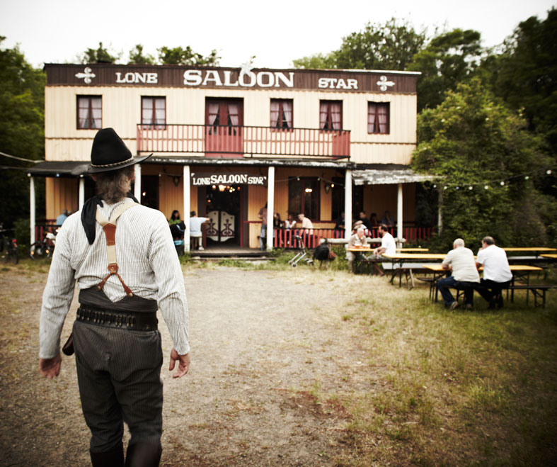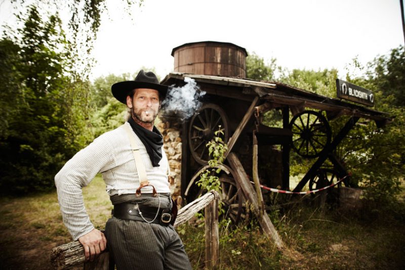 Noch sieht das Gelände jedoch ziemlich verlassen aus, fast so, als hätte uns jemand in einen Hinterhalt gelockt. Tapfer betreten wir die ausgestorbene Stadt und nehmen Kurs auf den Saloon. Hinterm Tresen ein erster Verdächtiger: Ein echter Cowboy mit grauem, schulterlangem Haar, Hut mit Klapperschlangenhaut und einem Outfit aus dem Texas von1870. In seinem linken Stiefelschaft steckt ein Spitzmesser, im Holster ein Patronenrevolver. Dessen sechsschüssige Trommel hält 45 mm Kaliber Munition bereit – und ist geladen. „Sind Sie Herr Hartmann?“, fragen wir vorsichtig. „Nennt mich Jesse“, sagt der Cowboy.