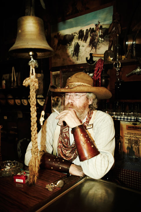 Um die laufenden Kosten für Reparaturen und Instandhaltung zu decken, wurde das Restaurant im Jahr 2000 öffentlich gemacht. Der Verein nimmt keine Mitgliedsbeiträge, aber von den Mitgliedern packt jeder unentgeltlich mit an. Der Jüngste im Bunde mit 32 Jahren ist Sebastian: Er kümmert sich um den Grill. Früher arbeitete er bei großen Lebensmittel-Discountern als Manager, heute studiert er wieder: Deutsch und Erdkunde auf Lehramt, aus Leidenschaft. Ein anderer Westernfan ist Manfred, 55 Jahre und Staplerfahrer bei einer Mainzer Baustofffirma. Er ist seit acht Jahren Mitglied bei den Old Trappers und heute Abend für die mexikanischen Bohnen zuständig. „Ich bin irgendwann mal mit einem Kollegen gekommen und seitdem hiergeblieben“, sagt er. „Ist super hier.“ Unserer Fotografin besonders sympathisch ist Lutz Sternberg, fünfzig Jahre, LKW-Fahrer und seit zehn Jahren Mitglied bei den Old Trappers. Wenn Lutz die Bretter im Saloon entlang schreitet, klingeln die Sporen an seinen Stiefeln. „Wir sind eine eingeschworene Truppe“, lässt er verlauten.