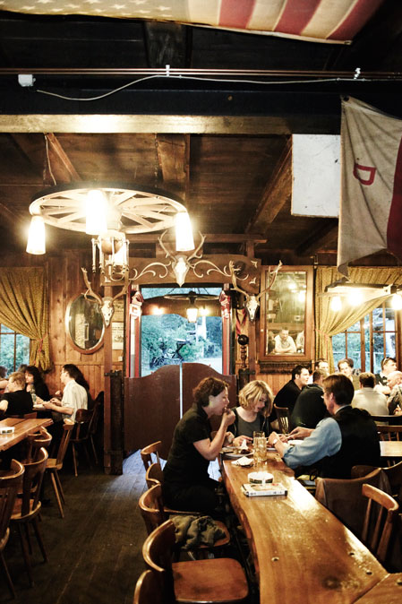 Jeden Samstag geht es hoch her bei den Trappers. Der Saloon wird geöffnet und viele Besucher kommen, um Western-Feeling zu erleben, abzuschalten oder einfach, um sich an den Mahlzeiten vom Indoor-Holzkohlegrill zu laben. Es gibt Bier, Whiskey und sehr empfehlenswerte 400 Gramm-Steaks vom Rind oder Schwein mit deftigen Bohnen. Manche Gäste kommen im Cowboy-Outfit, viele aber auch in Zivil oder mit ihren Kindern, Alt und Jung gemischt. Eine Frauengruppe schießt Fotosvon einigen Männern, die von Bürohengsten zu Großstadtcowboys avanciert sind. „Hier hat auch schon die komplette Frauenabteilung vom Josefskrankenhaus gefeiert“, erzählt Jesse, „das war die beste Party, die wir je hatten. Die haben in wirbelnden Röcken den Cancan getanzt und den Oberarzt haben sie im Knast eingesperrt.“ Auch das Bundeskriminalamt nutzt die Räumlichkeiten für Partys – einmal Sheriff ist eben immer Sheriff. Und so ziehen Jesse und Lutz an ihren Glimmstängeln und wir von dannen.