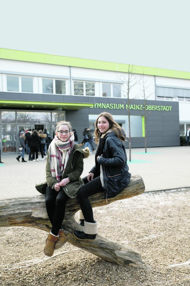 Lässig sitzen Sophie und Lola auf einem Ast vor ihrer Schule, dem Gymnasium Mainz-Oberstadt. Eine Dreiviertelstunde brauchen die Zwillinge jeden Morgen mit dem Bus, müssen dreimal umsteigen, bis sie von ihrem zuhause im beschaulichen Marienborn in der Schule sind. „Wir haben sogar Mitschüler, die jeden Tag aus Rüsselsheim kommen“, erzählt Sophie.
