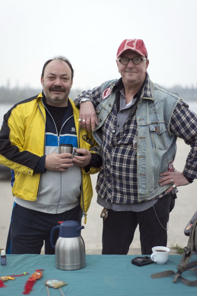 Den Stand teilt sich Mario mit Kumpel Wolf, den er zärtlich-ironisch „Wolle“ nennt. „Das darf aber nur er“, brummt der Hüne mit dem 05-Aufnäher an der Jacke. Tipps fürs heutige Auswärtsspiel? „Ich hoffe auf ein 2:1, aber leicht wird’s nicht.“ Seine Ware generiert er vor allem bei Haushaltsauflösungen, die er kostenlos übernimmt. Heute fällt ihm alles ein wenig schwerer als sonst: „Ich bin am Montag erst an der Schulter operiert worden.“ Aber deshalb zu Hause zu bleiben, das kam für ihn nicht in Frage: „Das war so ’ne absolute Vorfreude auf den Tag, endlich geht’s wieder los!“ Stereoboxen, Magazine und Modelleisenbahnen liegen sorgsam angeordnet auf seinem Verkaufstisch, nebenan sortiert ein Mann Bücher voll alter Postkarten und Briefmarken, während eine junge Frau tütenweise Spielzeug anschleppt und überall Tapeziertische aufgeklappt und dekoriert werden. Doch nicht nur besonders eifrige Verkäufer und neugierige Kunden sind zu früher Stunde am Rheinufer, auch Jogger sind unterwegs – sichtlich erstaunt über die ungewohnte Masse an Menschen; im Herbst und Winter konnten sie hier schließlich samstagmorgens beinahe unbeobachtet trainieren. Nun aber steigt so langsam auch die Lautstärke zwischen den ausladenden Bäumen, deren noch nackte Äste als Kleiderständer dienen. Viele Verkäufer kennen sich untereinander und schnacken gut gelaunt, an einem Stand knallen Sektkorken. Auf dem Weg künden leere Dosen und ein zertretener Wein-Tetrapak von den Flaneuren der letzten Nacht. Der Himmel sieht inzwischen wieder nach Regen aus.