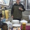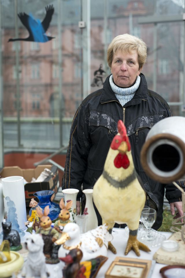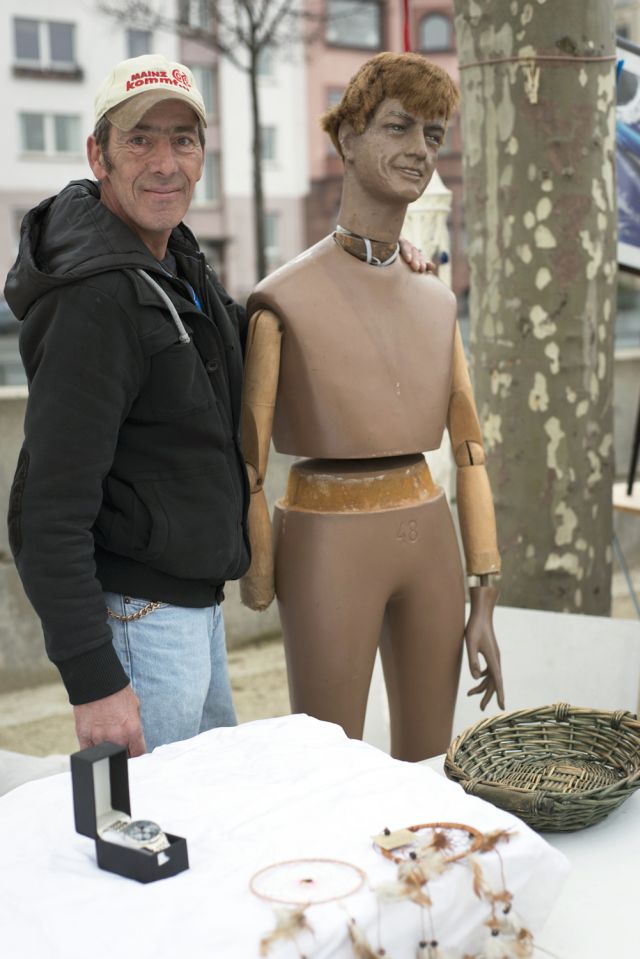 „Wir kommen seit 15 Jahren hierher“, erzählt Klaus, der seine Sachen über den Herbst in der Garage lagert: „Die ist bis oben voll.“ Weil die Freunde längst von seiner Trödelleidenschaft wissen, geht ihm und seiner Frau ihre Ware nie aus: „Wir kriegen immer neue Sachen.“ Am Stand findet sich Porzellangeschirr mit Goldkante neben alten Telefonen oder Duschgel, alles liebevoll herausgeputzt und angeordnet. „Die Leute kaufen alles“, sagt der Hesse mit einem Nicken und verrät auch sein Geheimnis: „Weil 90 Prozent der Besucher immer gleich sind, bringen wir jedes Mal andere Ware mit. Mal die eine Kiste, mal die andere. Das wissen die Leute zu schätzen!“ Auch Willy, der „echte Meenzer aus der Neustadt“ am Stand nebenan, schwört auf seine treue Stammkundschaft. „Die kommen immer wieder.“ Einer von ihnen hat sich gerade noch vorm offiziellen Verkaufsbeginn Schaufensterpuppe Oskar gesichert, der die letzten Tage als Open Air-Mitbewohner auf Willys Balkon verbracht hat – dabei hat Willy ihn schon ein wenig ins Herz geschlossen. Aber man muss sich eben auch mal trennen können …