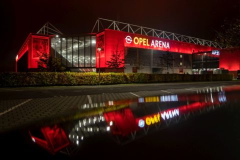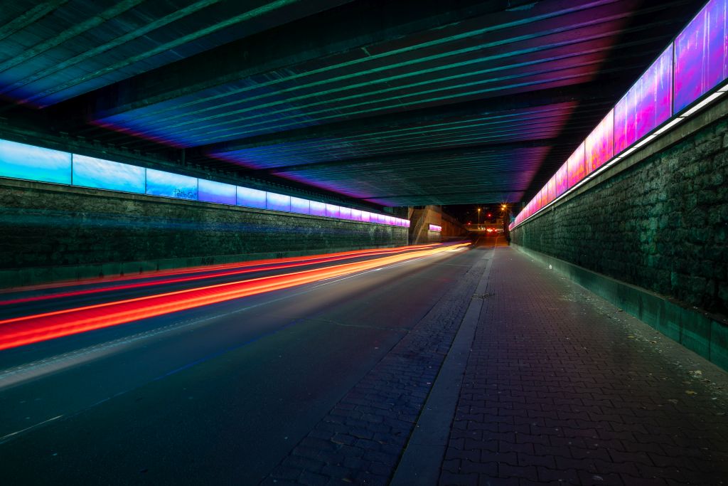 Ein gelungenes Beispiel für eine innovative und dabei günstige Beleuchtung stellt die Neugestaltung des Goethetunnels von 2012 dar. Das changierende Lichtband aus LED-Lampen und Radiant-Folien wirkt fast wie eine Installation. Die Farb-Licht- Bänder stellen eine gleichmäßige, normgerechte Ausleuchtung des Raums her und helfen andererseits durch ihre lineare Form und die Anordnung auf beiden Seiten, den Verkehr optisch zu führen. Damit gelang es, den ehemaligen Unort deutlich aufzuwerten. Eine ähnliche Lösung soll für die Ostein-Unterführung am Bahnhof geschaffen werden: Die Deutsche Bahn AG als Eigentümerin plant, die Unterführung vom Kaiser-Wilhelm- Ring zur Mombacher Straße in den nächsten Jahren von Grund auf zu sanieren und somit auch die Beleuchtungssituation zu verbessern. Woanders ist man da noch nicht so weit: Die maroden Kugelleuchten am Rheinufer vor dem Rathaus strahlen in alle Richtungen Licht in gleicher Intensität aus. Durch diesen Leuchtentyp aus den 70er-Jahren werden nachtaktive Insekten angelockt sowie der Nachthimmel überstrahlt. Die Kugelleuchten an der Uferpromenade sind zudem verdreckt und vergilbt, teils ist das Glas kaputt. Dennoch ist eine Erneuerung der Beleuchtung aktuell nicht vorgesehen. Auch das in Szene gesetzte nächtliche Stadion sieht zwar schön aus, zusammen mit den anderen Stadtlichtern erzeugt es jedoch eine schmutzig-rote Lichtglocke über der Stadt. Die sogenannte Lichtverschmutzung oder der Lichtsmog hat zur Folge, dass man in den Städten den Sternenhimmel kaum bis gar nicht mehr sieht.