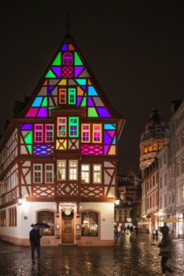 Zuletzt: Licht kann auch Kunst. Schon seit Mitte Dezember wird das neue Bürogebäude ZigZag am nördlichen Ende des Hafenbeckens interaktiv illuminiert. Das Besondere: Passanten können die Installation über eine App selbst steuern. Wer im Februar wehmütig ist, kann sich mit dem Szenario „Meenz bleibt Meenz“ ein wenig Fastnachtsstimmung an den Zollhafen holen – dann leuchtet ein Geschoss abwechselnd in Rot- Weiß-Blau-Gelb. Auch im Gebäudeinneren können künftige Mieter die Beleuchtung ihres Arbeitsplatzes nach individuellen Bedürfnissen über eine App steuern. Aber auch die Frankfurter Lichtkunst-Biennale Luminale hat in den vergangenen Jahren immer wieder mit Lichtinstallationen und Aktionen bis nach Mainz ausgestrahlt. Abgesehen vom künstlerischen Programm möchte das Festival einen nachhaltigen Beitrag zur Stadtentwicklung leisten – mit Projekten, die sich mit urbanen Visionen im Spannungsfeld von Licht, Architektur, Technologie, Ökologie, dem sozialen Miteinander in der Stadt oder mit ihrer Geschichte und Kultur auseinandersetzen. 2020 – die Luminale war dann doch ganz kurzfristig coronabedingt abgesagt worden – riefen die Veranstalter zum Lichtsparen auf, um es und somit die Energiekosten und Emissionen symbolisch der Luminale zu spenden. Das nächste Mal findet sie hoffentlich im Frühjahr 2022 statt.
