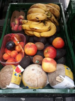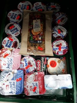 „Es ist schockierend, auf wie vielen Ebenen Lebensmittel weggeworfen werden“, sagt Martina. Die junge Frau ist im sozialen Bereich tätig und kämpft aus politischen Gründen gegen das Entsorgen von Brot, Eiern und Co., indem sie das Weggeworfene zurücknimmt. Dies ist formal ein Diebstahl – doch zu einer Anzeige ist es laut Martina noch nicht gekommen. Mehrere legale Initiativen bearbeiten das Thema Lebensmittelverwertung in Mainz, allen voran die „Mainzer Tafel“, aber auch der Verein „Foodsharing“, in dem Martina und Urs aktiv sind. In Bahnhofsnähe warten wir am Rolltor eines Supermarktes. Es wird geöffnet und mehrere Einkaufswagen mit Lebensmitteln stehen für uns bereit: Backwaren, Gemüse, Avocados. Urs (Biologe) und Carina (Ethnologie-Studentin) sortieren Verschimmeltes aus. Der Rest kommt in die „Fairteiler“. Dies sind Schränke, die öffentlich zugänglich sind und vom Verein befüllt und gepflegt werden. „Die Kunden achten in Bio-Läden besonders darauf, dass Obst und Gemüse einwandfrei aussehen“, bemerkt Urs. Die Müllquote sei hier also noch höher. Foodsharing ist entsprechend gut organisiert und wird mittlerweile von vielen Betrieben und der Stadt anerkannt. 60 Firmen machen mit bei der „Versorgung“, etwa 400 aktive Foodsharer in Mainz gebe es, so Urs und zwei Regeln: „Nichts Verwertbares wegwerfen, nichts weiterverkaufen.“