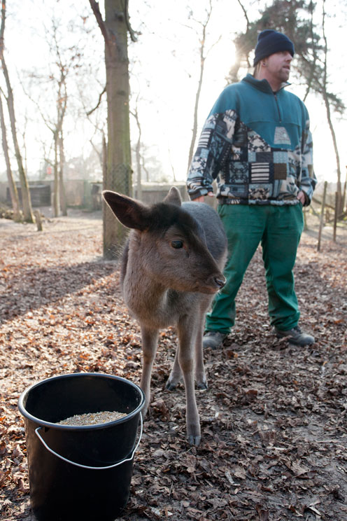 Wer sich um das Wohl von Tieren kümmert, braucht neben Begabung auch so etwas wie Leidenschaft für vierbeinige Wesen. Vielleicht war es diese besondere Hingabe, die den Tierpfleger Benedikt Körner dazu gebracht hat, „Bambi“ mit der Flasche aufzuziehen. Das Dammhirschweibchen lag eines Tages mutterseelenallein am Zaun des großen Hirschgeheges im Gonsenheimer Wildpark. „Es war bald klar, dass sich die Mutter um das Kleine nicht kümmern wollte, warum auch immer. Da hat man dann als Tierpfleger zwei Möglichkeiten: entweder man lässt es einschläfern oder man zieht es mit der Flasche auf.“ Was zunächst gar nicht so einfach war, musste Körner doch erst eine Bezugsquelle für Biestmilch finden. Diese Erstmilch von Säugetieren enthält wichtige Nährstoffe, die nötig sind, damit sich das Neugeborene gesund entwickeln kann. Schließlich wurde er bei einem Laubenheimer Bauern fündig, der den nahrhaften Saft noch in der Tiefkühltruhe vorrätig hatte. Bambi ist mittlerweile sechs Monate alt und weicht dem Pfleger nicht mehr von der Seite. Wenn er das Gehege betritt, sucht das grazile Wesen seine Nähe. Auch für Körner, der früher im Berliner Tierpark Elefanten betreut hat, eine neue Erfahrung. Die Nähe von Vierbeinern zu erleben, ohne sie sich dafür gleich in die eigenen vier Wände holen zu müssen, dafür ist der Gonsenheimer Wildpark das ideale Revier. Er wurde in den 50er-Jahren von der Jägerschaft Gonsenheim gegründet und als Gehege mit Hirschen und Wildschweinen eingerichtet. Später übernahm ihn ein Verein, der bald der Stadt Mainz die Betreuung überließ, ihn aber noch einige Zeit unterstützte. Heute beherbergt der Park zahlreiche Haustierrassen, Ziegen, Hängebauchschweine, eine Wassergeflügel-Anlage und nach wie vor Rothirsche, Damhirsche, Mufflons und Wildschweine.