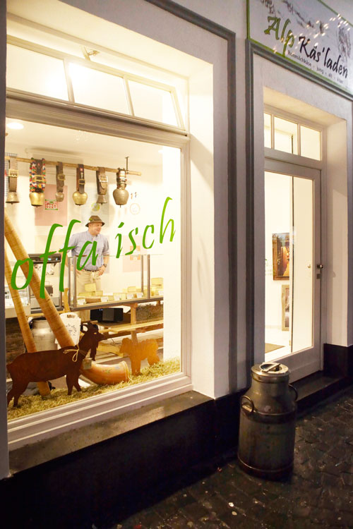 Über der Theke aufgereiht hängen schwere Kuhglocken. In den Schaufenstern große Alphörner, davor Milchkannen aus Aluminium und zur Dekoration etwas Heu. Hier dreht sich alles um die Alp und ihren Käse, den Alpkäs. Seit Oktober verwöhnt Inhaber Karl Pult – oder auch „Charly“, wie ihn seine Stammkunden nennen – die Mainzer mit Käsespezialitäten. Bisher hatte der dienstälteste Käsehändler seinen Stand auf dem Wochenmarkt. Nach zwölf Jahren tauschte er diesen nun gegen das Ladengeschäft in der Altstadt.