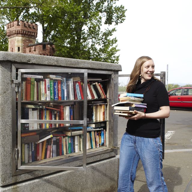 Fahrräder & Bücher zum mieten Wer nun denkt, alles was geteilt werden will, muss zuerst durchs Internet, sei beruhigt. Es gibt sie auch, die analogen Tauschoptionen. Einige sind gelb, mobil und inzwischen fester Bestandteil des Mainzer Stadtbildes geworden. Als vor drei Jahren die Andockstationen für die MVG-Räder wie Pilze aus dem Boden schossen, war manch einer skeptisch: Gibt es tatsächlich einen Markt für Menschen, die kein eigenes Rad wollen, sondern lieber jedes Mal ein neues leihen? Aber der Erfolg gibt den Verkehrsbetrieben recht: 15.500 registrierte Fahrrad-Leiher haben sich im vergangenen Jahr zusammengelegt 340.000mal auf die gelben Drahtesel geschwungen. Und die MVG geht für 2014 von noch höheren Zahlen aus. Und auch der immer volle Bücherkasten am Rhein zum Beispiel ist seit Jahren ein Beweis dafür, dass nicht alles vandaliert wird, was nicht nachts bei Drei auf den Bäumen ist. Vielmehr wird diese öffentliche Minibibliothek liebevoll gehegt und gepflegt und mit einem nicht enden wollenden Strom neuer Bücher versehen, die mitgenommen werden wollen. Oder der Metzger, der einem neben der Fleischworscht auch noch eine Auswahl seiner Lieblings-DVDs zum kostenlosen Probesehen mit nach Hause gibt. Allüberall wird geteilt. Foodsaverin Leila bringt es schön auf den Punkt: Teilen bringt neues Teilen hervor. Und macht glücklich. Versprochen!