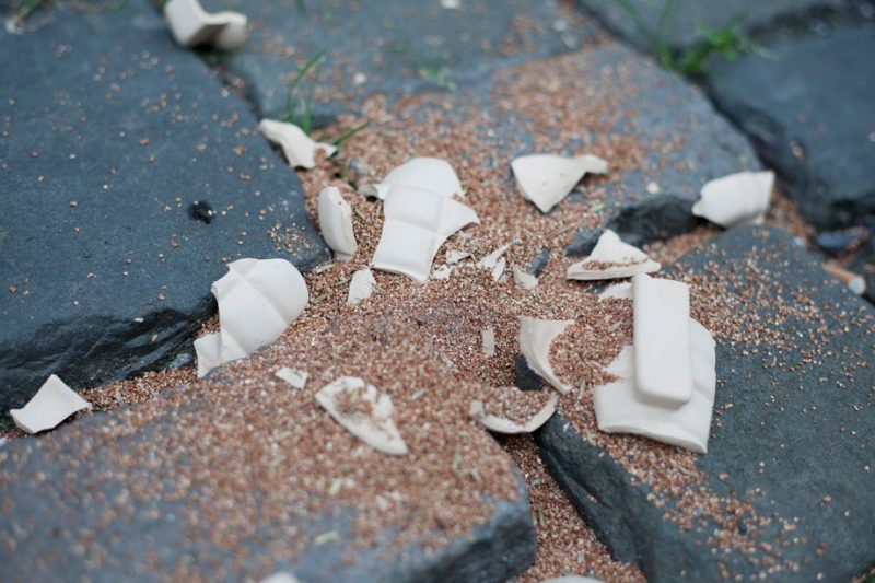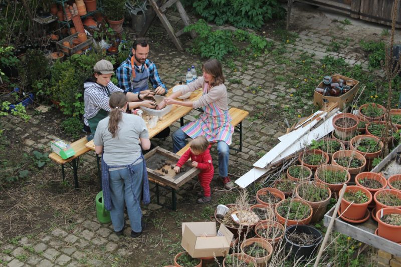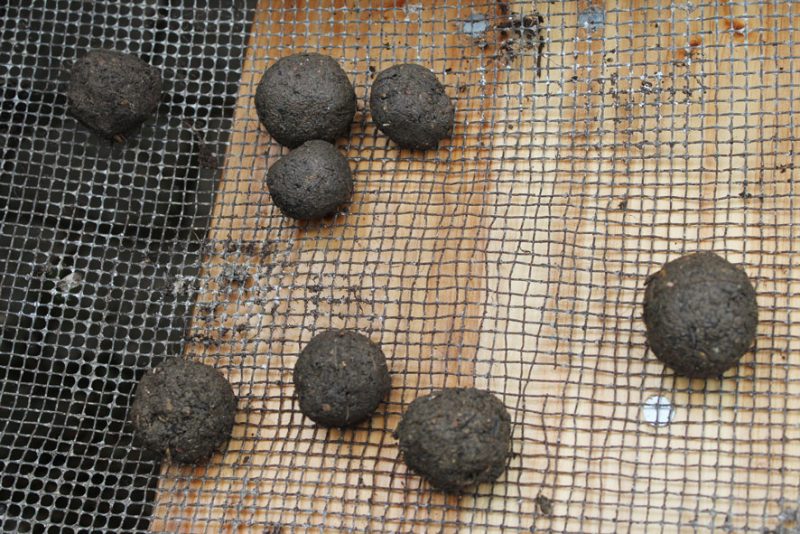 Als Vergleichsobjekte ormten wir aus Komposterde und Tonmehl eigene Samenbälle, die wir mit einer selbst gewonnenen Saatgut-Mischung bestückten. Ende Mai kam unsere Truppe der Möchtegern-Guerillagärtner dafür zusammen: Erde, Tonpulver und Samen wurden miteinander vermengt, dann wird Wasser zugegeben und alles gut miteinander verknetet. Aus der Masse formten wir kleine Kugeln von 2 bis 2,5 cm Durchmesser. Die fertigen Kugeln trockneten anschließend bei ca. 25 Grad Celsius etwa 2 Tage lang. (Bei den fertigen Seedballs entfällt natürlich die Arbeit im Matsch sowie die Trockenzeit…)