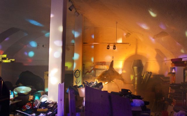 Das Highlight ist der riesige „Keller“, direkt unterhalb des Wohnraums, quasi ein eigenes Geschoss, vollgestopft mit Elektrogeräten, Einrichtungsgegenständen und skurrilen Überbleibseln vieler kreativer Projekte. An der Decke hängt ein überdimensionaler, blauer Hai aus Pappmaschee, den Claudius mit einem Freund für eine Veranstaltung im schon schön gebastelt hat. In einer anderen Ecke lagert der Prototyp des Internetbrunnens, der 2010 auf dem Jockel-Fuchs-Platz vor dem Mainzer Rathaus stand und deutschlandweit Aufsehen erregte. Schaut man sich etwas genauer um, stößt man außerdem auf ein Strahlenmessgerät, Leuchtreklameschilder, einen Oszillograph, ein EKG-Gerät und sogar einen Flux-Kompensator wie aus der Filmreihe „Zurück in die Zukunft“. „Ich lebe hier meinen Traum“, erzählt Claudius mit leuchtenden Augen. In einer normalen Wohnung wollte der Rotschopf nie wohnen, sondern war stets auf der Suche nach dem etwas anderen Lebens- und Wohnkonzept. Er hat sich alles selbst beigebracht und plant, irgendwann seinen eigenen Club aufzumachen: „Ich war ganz schön enttäuscht, als ich das erste Mal in einer Diskothek war. Meiner Meinung nach geben sich die meisten Besitzer mit der Ausstattung zu wenig Mühe, dabei kann man doch mit Licht- und Soundtechnik heute so großartige Sachen machen.“ Moritz nickt zustimmend. Dass die beiden derartige Vorhaben in die Tat umsetzen können, daran besteht kein Zweifel …