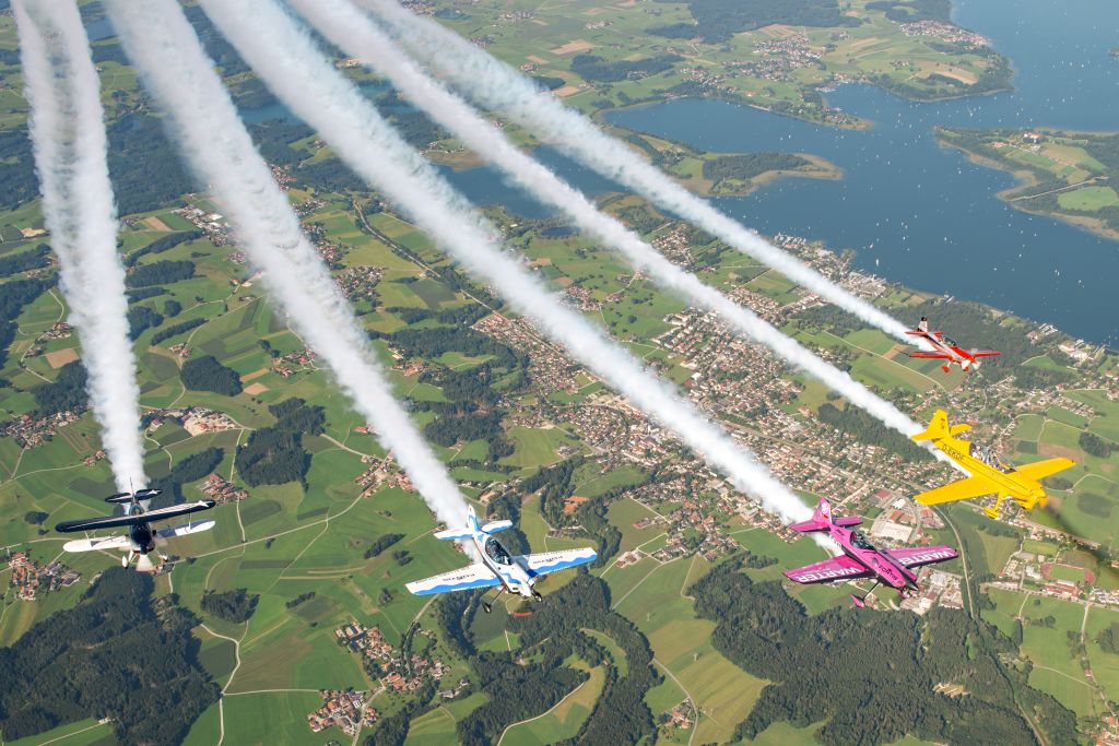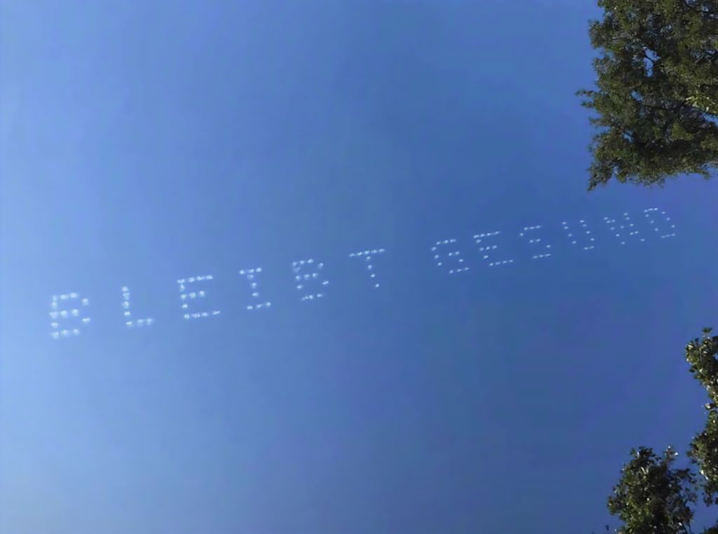 Nach inzwischen mehr als 20 Flügen über deutschen Städten ist die Technik und Flight- Crew zum Texten bestens eingespielt. Um die Schrift am Himmel erzeugen zu können, sind fünf der einmotorigen Kunstflugzeuge als Formation in etwa 3.000 Metern Höhe unterwegs. Angeführt wird sie in der Mitte von Tibo, dessen Flugzeug mit der Masterbox ausgestattet ist. Diese sendet über WLAN „Befehle“ an die anderen vier Flugzeuge. Die Buchstaben entstehen, ähnlich wie bei einem Nadeldrucker, durch die Abgabe von Punkten. Jedes Flugzeug setzt im vom Computer gesteuerten Takt jeweils einen Punkt ab, bis das zuvor programmierte Schriftbild steht. Die Punkte sind genau genommen kleine Wölkchen, die durch das Verdampfen von erhitztem Paraffin, das in den Abgastrakt geschleust wird, entstehen. Auf absolute Präzision kommt es nicht nur dabei an. Die Piloten müssen auch ihre Position exakt einhalten und das bei einer Geschwindigkeit von 220 km/h und im seitlichen Abstand von 30 Metern. Das können nur Profis, die aufeinander eingespielt sind. „Man muss schon ein riesiges Vertrauen zueinander haben“, sagt Bernhard Diehl, der mit anderen über langjährige Kunstflugerfahrung bei Flugshows verfügt.