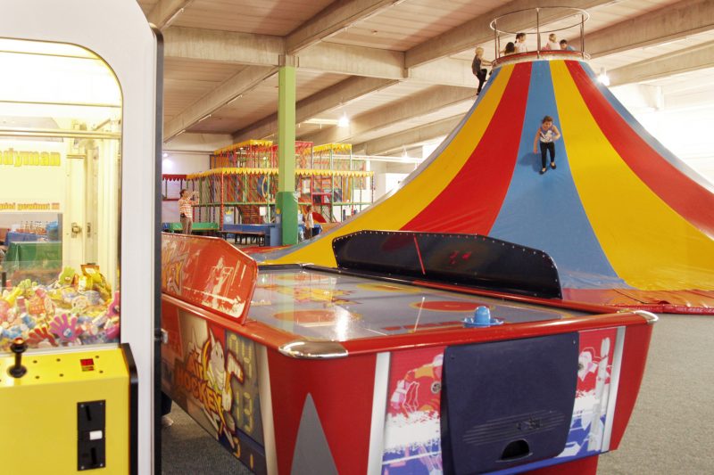Versteckt unter einer Hochbrücke und hinter der Zwerchallee liegt das Rambazamba. Mit dem Auto gut zu erreichen, die nächste Haltestelle, der Bismarckplatz, ist allerdings einige Minuten Fußweg entfernt. Beim Betreten der Halle fällt sofort die Helligkeit auf: Große Fenster lassen Tageslicht herein. Ein Pluspunkt gegenüber den anderen Spielplätzen. Insgesamt besticht das Rambazamba durch die angenehme Atmosphäre. Im gemütlichen Sitzbereich können Eltern entspannt Platz nehmen, zumal auch der große Spielbereich einigermaßen einsehbar ist. Das obligatorische Schuhe ausziehen wird hier leicht gemacht: Direkt am Eingang befindet sich ein Garderobenbereich. Auf Socken geht es dann los. Als erstes wird der Hindernisund Kletterparcours mit den integrierten Rutschen und dem Softball-Shooter in Beschlag genommen. Im Parcours brauchen die Kleineren allerdings Hilfe. Manche der Hindernisse sind für Dreijährige einfach zu schwierig. Danach kommen auch Trampolin, Hüpfburg, Krokodil, Riesenrutsche und der Kleinkindbereich zum Zug. Diverse Dreiräder und Bobbycars laden auf der eigenen Rennstrecke zum Wettrennen ein. Das Fuß- und Basketballfeld bleib von den Testkindern unbeachtet.