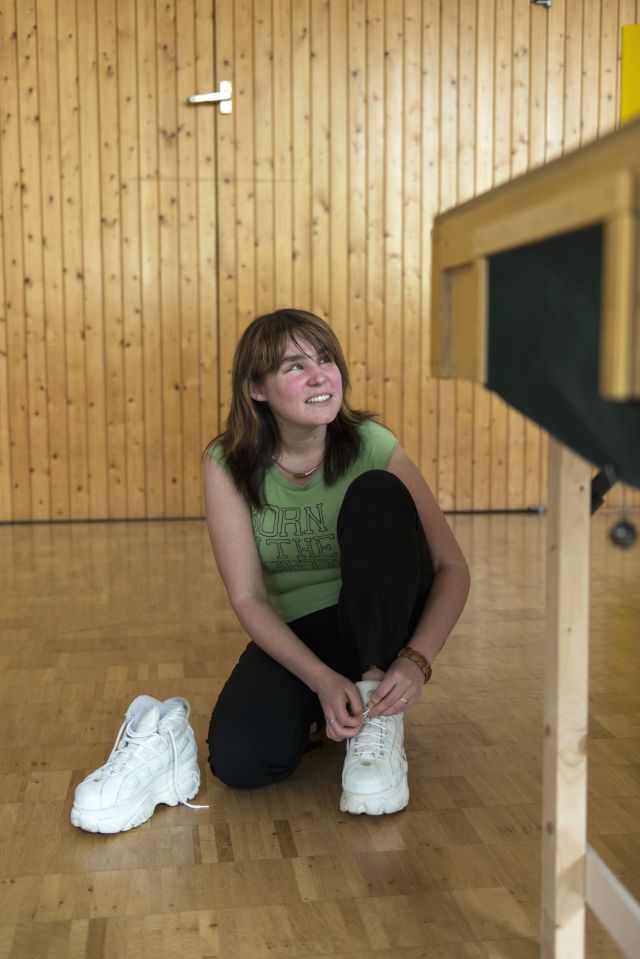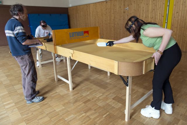Nach der Schule folgt die Ausbildung zur Fremdsprachensekretärin. Für einen Job am Max-Planck-Institut zieht Melanie nach Mainz. „Ich hatte nie Angst davor, rauszugehen, wie ich es von anderen Blinden kenne.“ Wieder ein leichtes Achselzucken. „Die Leute sagen, man wird als Blinder ausgegrenzt, aber wer sich über die Blindheit definiert, grenzt sich selbst aus“, erklärt sie. „So bist du gar nicht“, bekräftigt Andreas Hanewald. Der 40-Jährige ist Melanies Lebensgefährte, die beiden haben sich im Job kennen gelernt. Wie macht man sich ein Bild vom Partner, wenn die Augen keine Informationen übermitteln? „Ich mache mir ein Bild davon, ob er lieb ist, ehrlich, zuverlässig. Der Rest ist mir egal. Und dass Blinde Menschen abtasten, um zu erfühlen, wie sie aussehen, ist eh ein Mythos“, sagt Melanie und lacht. Im Hintergrund ist währenddessen ein lautes, rasselndes Klappern zu hören. In der Turnhalle übt Reiner Hoster seinen Aufschlag beim Tisch- tennis. Die Platte, die unter seinen donnernden Schlägen erzittert, erinnert auf den ersten Blick eher an Billard oder Tischfußball. Aus hellem Holz extra für den „Reha und Gesundheitssport Mainz e.V.“ gefertigt, ist diese von einem etwa 20 Zentimeter hohen Rand umgeben. In der Mitte thront eine Bande, die der Ball nicht treffen darf: „Er muss drunter durch“, erklärt Melanie. „Sonst gibt es einen Strafpunkt.“ Seit 2012 gibt es den Verein mit derzeit zwölf Mitgliedern, jeden Samstag werden die Duelle an der Tischtennisplatte ausgetragen. Andreas ist der Schiedsrichter. Mit seiner Handpfeife gibt er das Signal zum Aufschlag und verkündet die aktuellen Spielstände. „Ein sehender Schiedsrichter ist Pflicht“, sagt Melanie. Auch beim Spiel sind Sehende erlaubt, jeder Spieler trägt ohnehin eine Augenmaske. „Es gibt ja Sehbehinderte mit Restsicht, das wäre unfair.“ Der Schläger ist nicht rund, sondern sieht aus wie ein kleines Paddel. Im Spiel darf nur eine Hand genutzt werden, geschützt durch einen Handschuh. „Der Ball ist ja sehr schnell, wenn man den abbekommt tut das sonst echt weh“, sagt Melanie, die mit Plateauturnschuhen an der Platte steht und lachend erklärt: „Ich bin so klein, dass ich sonst keine gute Höhe habe für das Spiel.“ Dessen Ziel ist es, Tore zu schießen: Auf jeder Seite der Platte kann der Ball, der bei jeder Bewegung rasselt, in der Platte versenkt werden. Melanie bewegt den Kopf mit dem Weg des Balles. Die Aufmerksamkeit, mit der sie das Spielgerät verfolgt ist so greifbar, fast scheint es, als würde sie die Ohren aufstellen wie ein Raubtier auf der Lauer. Das Sonnenlicht fällt durch die großen Fenster schräg in die Halle, in der es angenehm kühl ist. Reiner ist mit den Händen mehr in Bewegung, scheint das Spiel anders zu antizipieren. Vielleicht, weil er nicht von Geburt an blind ist, eine Erinnerung hat daran, wie die Welt aussieht – und sich deshalb weniger auf sein Gehör verlässt? „Was ich definitiv feststelle ist, dass Erblindete eine bessere Orientierung haben als ich“, kommentiert Melanie. Sie behilft sich mit dem Smartphone: „Das macht mich noch mal selbstständiger. Über bestimmte Apps kann ich mir alles ansagen lassen, die Bedienung ist total einfach und zum Navigieren in unbekannten Städten ist es nicht wegzudenken.“ Wieder lacht die junge Frau. „Früher musste ich der Nase nach zum nächsten Mägges, jetzt lasse ich mir ansagen, wo ein Bäcker ist.“