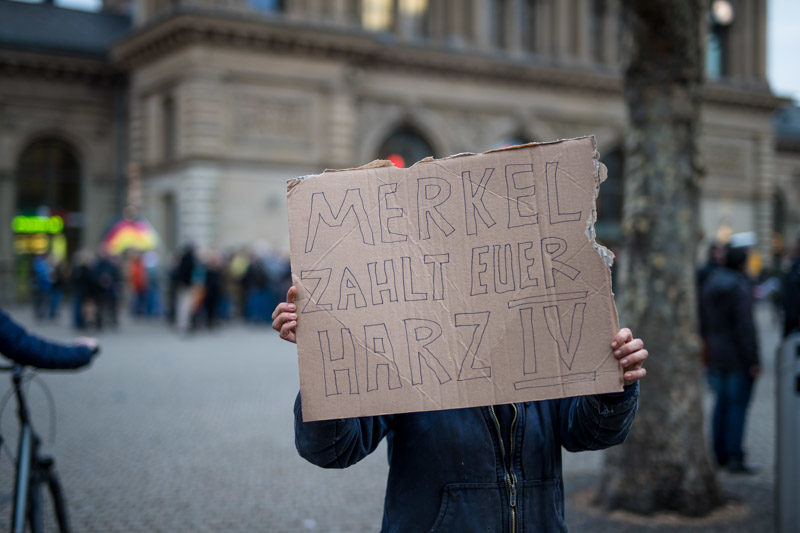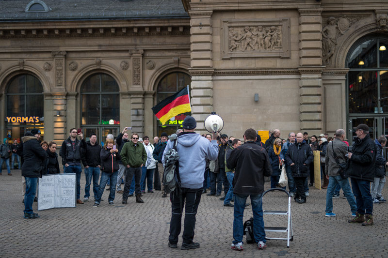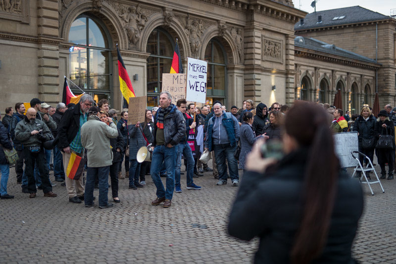 An einer Kundgebung am Hauptbahnhof unter dem Motto „Merkel muss weg“ haben am Montag rund 70 Menschen teilgenommen. Die Demos sind gerade scheinbar überall und werden von einigen Rechten organisiert. Die Demonstranten sagen über sich, sie seien besorgte Bürger und hätten einfach nur genug von Merkel. Einige der Organisatoren kommen aus dem rechtsextremen Türsteher- und Hooligan-Milieu. Auch die „nicht-extremistischen Teilnehmer“ der Demo wissen wohl, mit wem sie da demonstrierten. Unser Fotograf Stephan hat ein paar Schnappschüsse erstellt und wurde auch selbst viel fotografiert – von rechter wie von linker Seite.