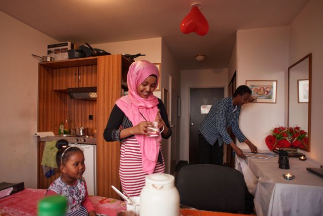 19 Quadratmeter im neunten Stock eines Hochhauses in der Oberstadt. Ein flaches Doppelbett füllt den halben Raum. Daneben steht ein kleiner Tisch mit Tee und Keksen. Im Fernseher läuft eine Zeichentrickserie: „Das hilft uns, Deutsch zu lernen“, sagt Nuur mit Blick auf den Bildschirm. Der 27-Jährige wohnt hier seit einem Jahr mit Frau Nasteha, 25, und Tochter Nasra, 4, die wie er aus Somalia geflohen sind. Somalia gehört laut Deutschem Aufenthaltsgesetz zu den Herkunftsländern mit „Bleibeperspektive“ in Deutschland. Anders als bei Flüchtlingen aus sogenannten „sicheren Herkunftsländern“ wird bei Somaliern wie Nuur von einem dauerhaften Aufenthalt ausgegangen. „Deutschland ist unsere neue Heimat“, bedeutet das für ihn.