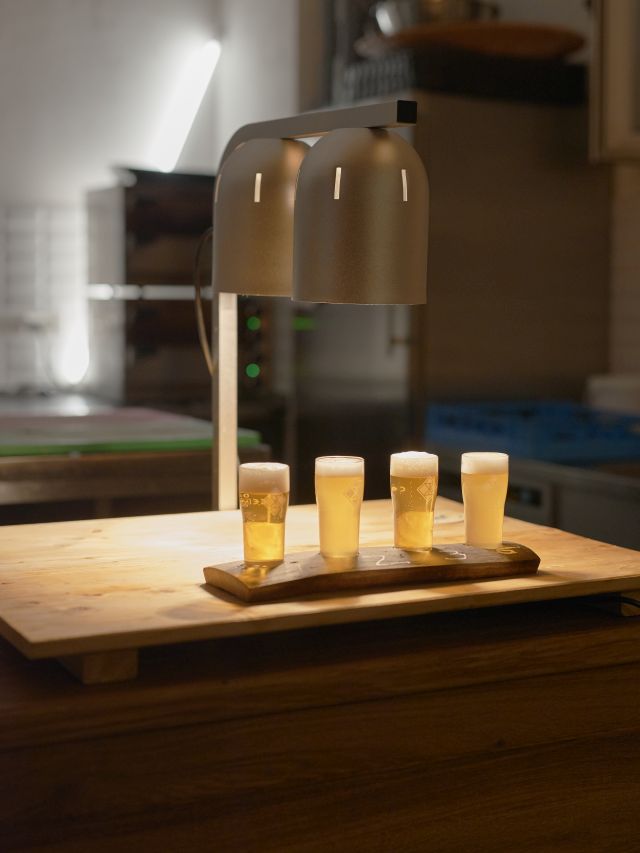 Auch das Publikum von Eulchen ist mittlerweile gut durchmischt. Denn neben der Brauerei betreiben sie auch noch den Schlossbiergarten und die alteingesessene Kneipe „Klingelbeutel“ in der Altstadt. Doch der Schankraum in der Brauerei auf dem Kupferberg ist nun das Herzstück: „Es hätte ein kleiner Ausschank werden sollen. Jetzt ist es etwas größer geworden“, gibt Philip zu, kann aber den Stolz über den imposanten Raum nicht verhehlen. Den beiden Gründern lag es am Herzen, so viel wie möglich vom historischen Charme des Gebäudes mitzunehmen, weswegen sie im Zuge der Bauarbeiten teils zugemauerte Teile und Tore freigelegt haben. Eine riesige Ansammlung leerer grüner Flaschen erinnert an die Sektkellerei, die hier einst ihren Sitz hatte. Gleichzeitig wollte man dem neuen Saal einen eigenen Stempel aufdrücken, was dem Duo mit einer großen Tafel in der Mitte des Raumes oder kleinen Details wie hübsch verkupferten Lampen gelungen ist. „Altes zu bewahren, aber auch in unsere Zeit zu übersetzen und ein bisschen neu zu interpretieren“ sei ein Motto, welches sich in den letzten Jahren für Eulchen, nicht zuletzt bei den Bieren, bewährt hat. Insgesamt zwölf Zapfhähne stehen bereit, was bedeutet, dass sich das Eulchen-Sortiment weiter ausweitet. Saisonale Biere wie ein Frühlingsbock sollen ebenso angeboten werden wie Spezialanfertigungen und Biere, die sich vom bisherigen Repertoire unterscheiden. Auch Kooperationen sowie Kreationen anderer Brauereien sollen durch die Zapfleitungen fließen. Im Sommer ist ein Außenbereich geplant. Wie bei den Kollegen von Kuehn Kunz Rosen werden auch hier Snacks angeboten. In Kooperation mit dem benachbarten Restaurant gibt es eine kleine, auf die Biere abgestimmte Karte.