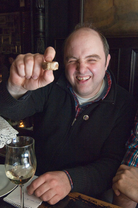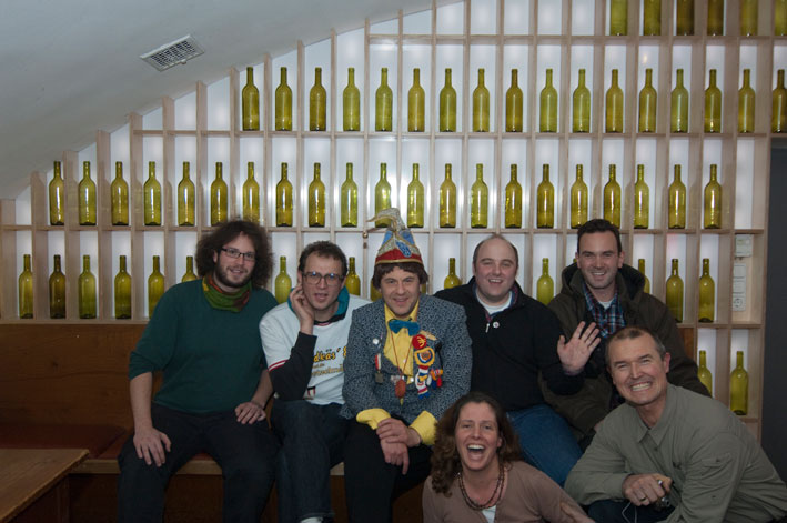 Unser Tester Neustadt-Fred verfolgt das gleiche Ziel von Mainz aus, manchmal mit skurrilen Mitteln: „Hier, riechen Sie mal“, hält er der Wirtin ein Plastikbeutelchen hin, in dem ein dunkelbraunes Etwas liegt. „Huuu…“ entfährt es allen, als wir den intensiven Geruch abbekommen. „Das ist der älteste Handkäs von Mainz“, beeindruckt er uns: „Acht Jahre alt. Daraus lasse ich mir jetzt von einer Goldschmiedin einen Ring machen.“ Wir sind verblüfft von Neustadt-Fred, der eigentlich als Endie Neumann im Kaiser-Wilhelm-Ring einen Underground-Bekleidungsladen führt. Zur Deko legt jetzt Handkäs-Ede noch zwei Gummi-Handkäse auf den Tisch. Diese Typen haben ja wirklich nur Handkäs im Kopf! Nur gut, so zwei Cracks dabei zu haben. Der Test geht weiter: Das gereichte Landbrot ist knusprig und schmeckt hervorragend. Etwas dominant sei der Weingeschmack, bemängelt Ede. Dennoch: sehr rund im Gesamteindruck. Doch schnell müssen wir weiter.