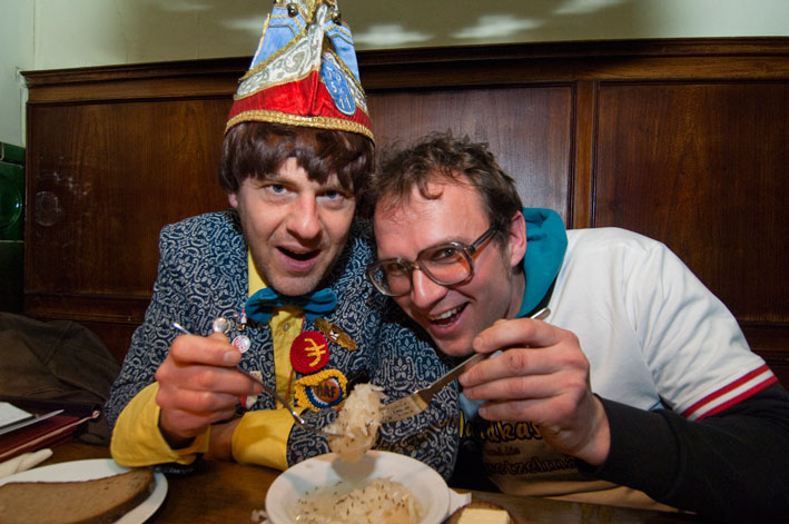 „Das ist für mich jetzt wie im Dschungel-Camp“ – unser Chefredakteur verzieht das Gesicht, als die Wirtin mit den Handkäs-Tellern kommt. Wir sitzen im Weinhaus Wilhelmi in der Rheinstraße. „Unser Handkäs ist in Bacchus-Wein eingelegt und am Tisch gießen wir immer nochmal einen Schluck drüber“, erklärt Christina Schickert, die Inhaberin der Traditionsgaststätte. Schon nach dem ersten Bissen hellt sich die Mine des eben noch skeptischen Journalisten auf – „mhhhh, gar nicht so übel“. Auch unsere Experten sind sehr angetan: „Schön durch, der Handkäs“, schwärmt Handkäs-Ede, alias Michael Hamann, der mit seiner Punkband „Handkäs-Ede und die Brezelmänner“ im weiten Umkreis in Mission Handkäs unterwegs ist. „Viele junge Leute wissen einfach nicht, wie klasse der schmeckt“ – das soll die Welt erfahren.