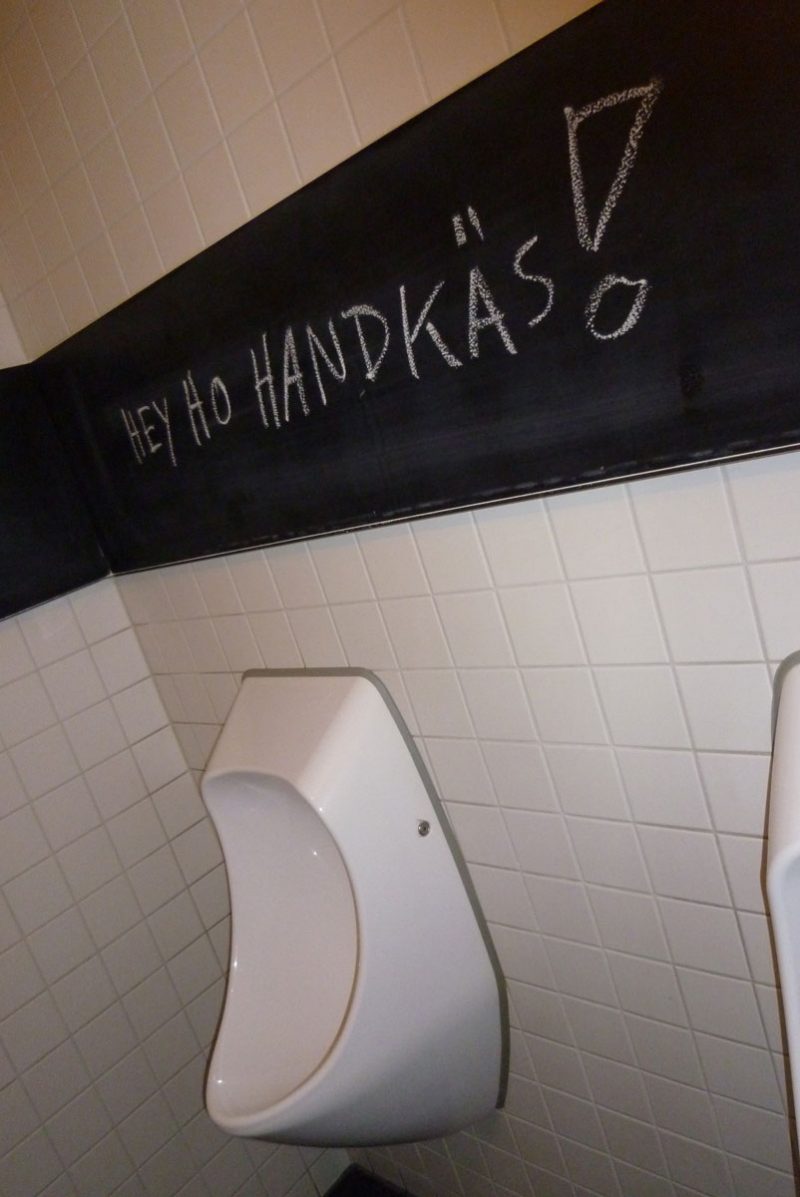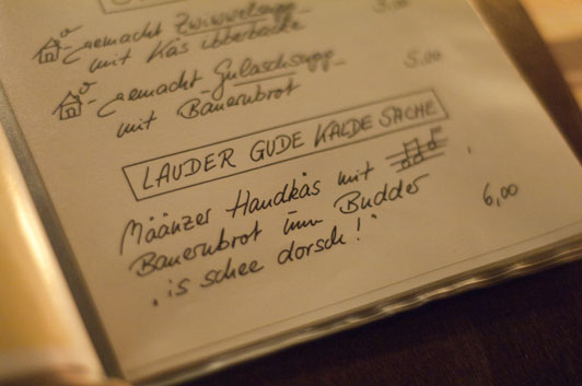 Die Zeit wird knapp – wir müssen uns beeilen. Denn zumindest das Weinhaus Michel in der Jakobsbergstraße muss es noch sein. Hier erleben wir einen Abschluss, wie er schöner nicht sein könnte. Die Inhaber Astrid und Stefan Michel, die hier eigene Weine aus dem rheinhessischen Weinolsheim ausschenken, zeigen viel Liebe fürs Detail: Serviert wird der Handkäs in großen Steingut-Schalen mit der Aufschrift „Määnzer Handkäs“. Am stillen Örtchen steht mit Kreide auf Schiefertafeln „Hey ho Handkäs!“ und „Ich kann kein Handkäs mehr sehen“… in diesem Laden geht man´s richtig mit Humor an. Und auch die Qualität stimmt: Der Käse ist würzig, bissfest, aber dennoch gut reif und markant. Wir beißen in ein knuspriges Bauernbrot und die „Musik“ ist ein guter Begleiter – auch auf dem Nachhauseweg. Wir haben einen großen Abend erlebt. Satt und selig warte ich auf meinen Nachtbus – und irgendwie meine ich in der Ferne so etwas wie Domglocken läuten zu hören…