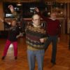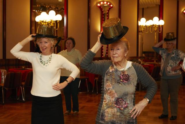 Die Eheleute tanzten früher schon gerne. „Nach der Rente fangen wir wieder an“, haben sie beschlossen und dies in die Tat umgesetzt. Eine Teilnehmerin kommt sogar mit dem Rollator. Der wird in die Ecke gestellt. Nicht mehr so gut zu Fuß zu sein, hält keinen davon ab, tänzerisch aktiv zu werden. Die Tanz-lehrerin entert die Bühne und die Musik setzt ein: „Do you love me“. Claudia tanzt vor und die Damen und Herren schwingen die Beine. Weiter geht’s mit „Daddy cool“. Claudia zeigt Schrittfolgen und Bewegungen: „Wolle wickeln“ -„Ententanz“ -„Ausfallschritt“ -„den rechten Arm recken“… Bei so viel Engagement merkt man kaum, dass geschickt die eine oder andere gymnastische Übung einbaut ist: „Nach so einer Kursstunde sollen alle Gliedmaßen mal bewegt worden sein.“