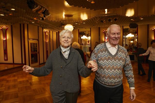 Dienstag. Kurz nach drei. Der große Saal leuchtet in allen Facetten bis hin zu Discokugeln und einer kleinen Bühne mit verspiegelter Rückwand. Die ersten Tänzerinnen und Tänzer trudeln ein. Auch etliche Männer sind dabei. „Solo“ heißt, man muss keinen festen Tanzpartner haben, aber „es kommen mehr und mehr Männer“, freut sich Claudia. So auch Walter: „Meine Frau geht montags zu „Tanz fit Sport“, das ist etwas fordernder“, erzählt er. „Und freitags und sonntags gehen wir gemeinsam zum Paartanzen.“