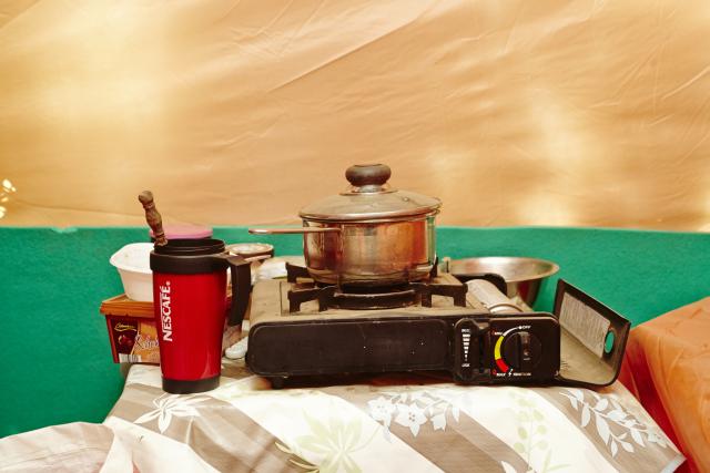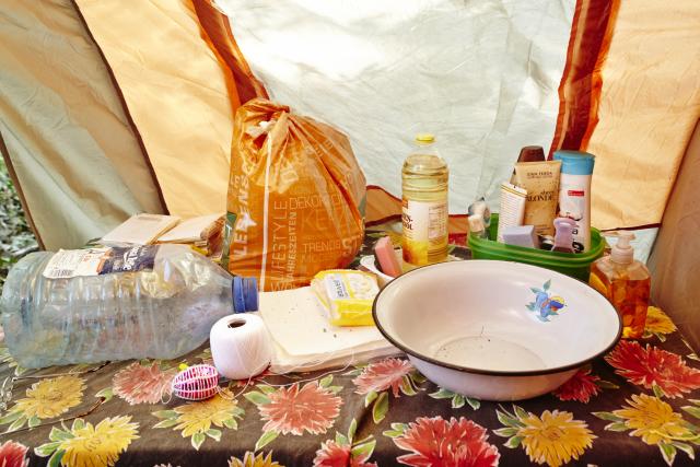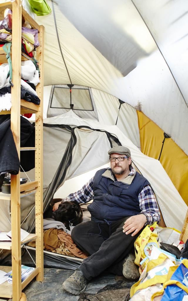 In einem der Schlafzelte steht ein Schreibtisch; darauf eine Lesebrille und ein aufgeschlagenes, leicht zerfleddertes Taschenbuch. Das Küchenzelt überdeckt die Kochstelle samt dem alten, aber sauberen Gasherd. Sogar ein WC-Zelt gibt es, mit einem Toilettenstuhl und einem Kanister mit Wasser zum Händewaschen; daneben steht ein Spender mit rosafarbener Seife. Und zwischen allem: drei lebhafte Hunde. Keine Frage, diese kleine Zeltstadt ist ein Zuhause – und zwar das von zwei wohnungslosen Menschen, Pascal Schmit (45) und Ma-ah-tee (60). Seit Jahren haben sie ihre „Platte“ auf dem brachliegenden Grundstück am Fort Hauptstein, nur drei Minuten Fußweg von der Beratungsstelle und dem Tagesaufenthalt der Evangelischen Wohnungslosenhilfe entfernt.