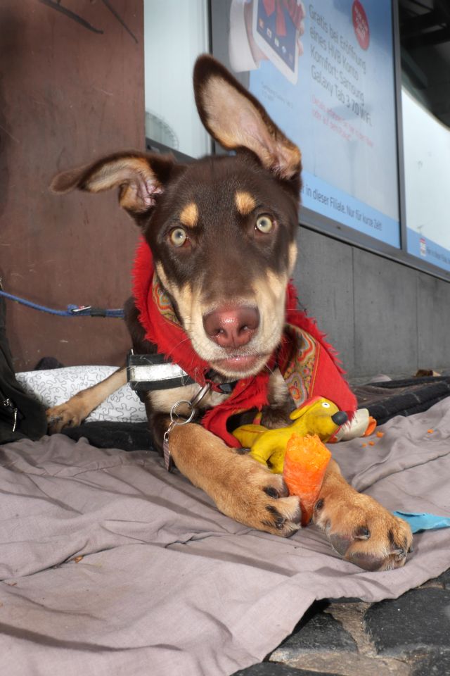 Der Platz, an dem ich sitze, hat sich so ergeben. Es ist ein super Platz, so vom optischen Spektrum. Hier kommt die halbe Stadt vorbei, manche zufällig, manche gezielt. Die einen kommen nur zum Hunde streicheln, manche, um mir was zu geben oder einen schönen Tag zu wünschen. Manche kommen, weil sie sehr alleine sind auf ein Schwätzchen. Es ist zwar materiell nix besonderes, aber ich gebe den Leuten auf meine Art auch ein bisschen was. Während Joschi erzählt, pfeift der kalte Herbstwind über den Asphalt. Gemütlich ist anders. Eine Dame im Rentenalter mit schlesischem Akzent kommt. Joschi begrüßt sie als Maria. Sie überreicht ihm zwei pralle Plastiktüten mit warmen Einlagen, dicken Socken und Winterschuhen: „Ich habe gesehen, dass Du nur so dünne Socken an hast bei der Kälte. Ich weiß was es heißt zu frieren“, erzählt Maria, „mit sechs holte ich mir Rheuma, weil ich bis zum Hals im Eiswasser stand, um mit meinem Vater Schilf zu schneiden. Der Mann war schlimmer als Hitler.“ Joschi bedankt sich gerührt, ich staune. Die spendable Dame verlässt uns und Joschi erklärt: „Sowas jetzt gerade wo es kalt wird. Da kommt mehr, wie ich eigentlich nutzen kann. Wenn es dann nicht meine Größe ist, guck ich, dass ich noch jemand anderem etwas abgebe, die nicht so … weil, Sie haben es in den paar Minuten gesehen … es geht uns wirklich nicht schlecht. Normal wenn mich jemand fragt, sage ich, unter richtig gut versteh ich etwas anderes, aber schlecht wäre gelogen. Auch ohne dass ich staatliche Hilfe in Anspruch nehme, komme ich ganz gut über die Runden.“ Passanten schenken zwei Flaschen Wein, ohne zu wissen, dass Joschi seit zehn Jahren keinen Alkohol mehr trinkt. Nur essen würde er ihn, in Saucen, die er zum Essen kocht. Einige Münzen schlagen in der Messingschale auf. Vom früheren Koch möchte ich noch wissen, wie eine ordentliche Weihnachtsgans zubereitet wird. Für eine Weihnachtsgans ist ein gutes Ausgangsprodukt ideal. Wenn es geht, keine tiefgefrorene. Es sollte keine Mastgans sein, die hat zu schnell gewachsenes Fleisch, wie bei allen Tieren aus Turbomastbetrieben. Pfeffern, salzen, mit Majoran einreiben, dann am besten mit Äpfeln und Suppengrün füllen. Das gibt Geschmack ab. Bei 180 bis 200 Grad ab in den Ofen, erst auf der Brustseite braten, damit das Fett heraus läuft. Kurz bevor sie fertig ist, mit Apfelsaft ablöschen und Honig glasieren. Dann ist Vorsicht geboten, auf Sekunden achten. Mit der Honigglasur kann sie von einem auf den anderen Moment schwarz und bitter werden. Für 4 Personen sollte die Gans um die 3,5 Kilo wiegen. Da ist das Fleisch-Knochen-Verhältnis am besten. Dazu Knödel, Rosenkohl oder Rotkraut.
