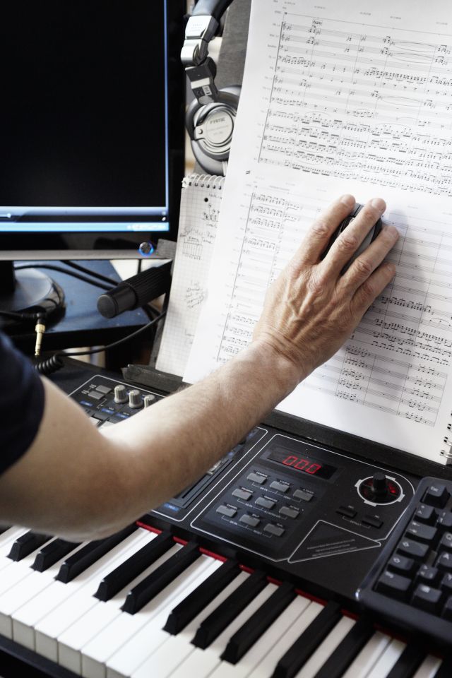 Wenn Bernd Thewes komponiert, sitzt er im hinteren Zimmer seiner Musikwerkstatt in der Mitte des Raumes am Keyboard. Rechts und links von dem DIN A3-großen Notenbuch breiten sich zwei Bildschirme aus. „Die brauche ich beide, rechts läuft das Notenprogramm und links der Film. Die Musik muss schließlich exakt auf den Film passen“, erklärt Thewes. Dabei beginnt die Komposition eines jeden Stücks mit dem Zusammensuchen von alten Zeitungsartikeln aus Archiven. Denn Thewes vertont hauptsächlich Filme aus den 20er Jahren. In die Zeit und Geschichte der Stücke muss er sich hineinversetzen können. Damals entstand auch die so genannte „Neue Musik / Moderne“, parallel zur Avantgarde. Sie widersetzte sich teils radikal dem Harmonieverständnis der klassischen Romantik und nutzte neue Formen und Rhythmen. Als Protest sehnte sie sich nach Fortschritt und Modernität. So erklingen bei Thewes statt Melodien auch schon mal Geräusche und abstraktere Sachen.