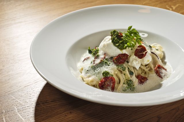 Zutaten: 500g Capellini, 4 kleine Portionen Wildkräutersalat (je nach Jahreszeit bestehend aus Sauerampfer, Blutampfer, Senfkraut, Löwenzahn, Pimpernelle, Boretsch, Schafgarbe, …) 4 Tomaten, 350g Ziegenfrischkäse, für das Pistou (Petersilienpesto): 1 Bund Petersilie, 20g geröstete Pinienkerne, Olivenöl, 20g geriebenen Parmesankäse, Meer-Salz, Pfeffer, Muskat.