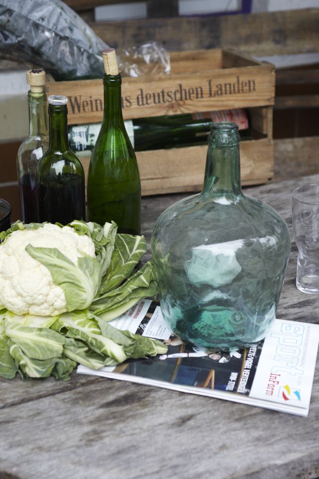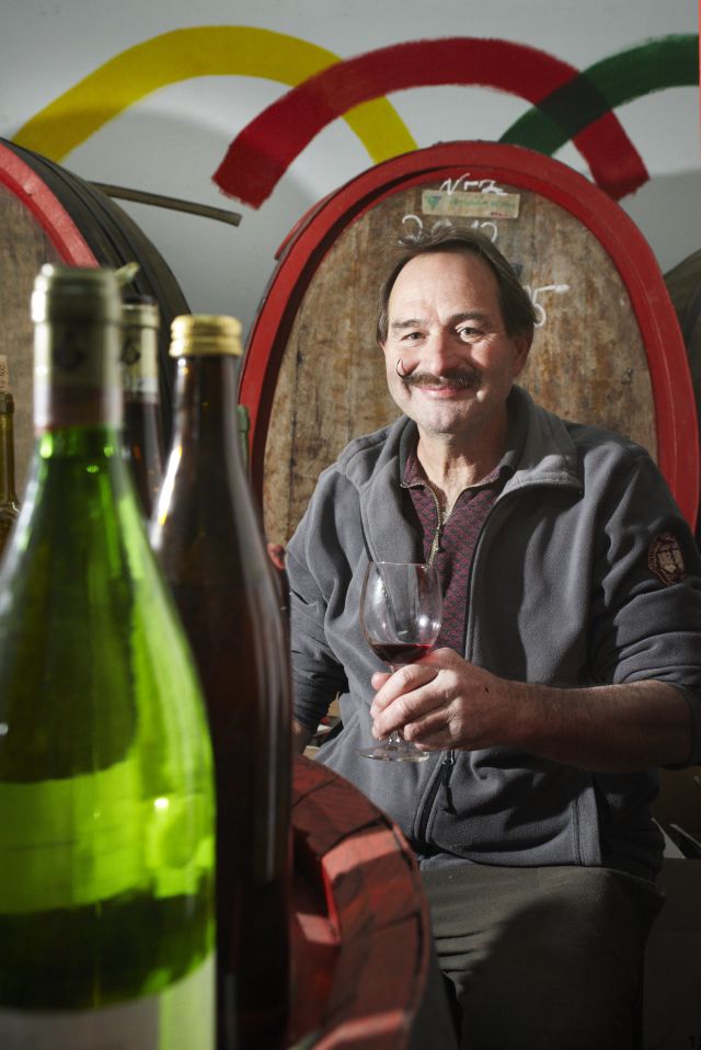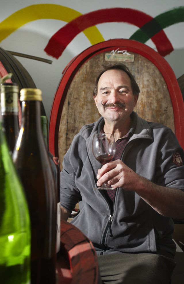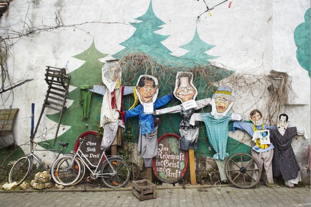 Gar nicht weit ist es bis Zornheim, dahin kommt man sogar mit dem Stadtbus. Beim Winzer Herbert Braunbeck kann man was erleben! Im Hof wird man von lebensgroßen Cartoon-Figuren empfangen – die politische Einstellung von Herr Bert wird damit sofort klar – und die ungewöhnliche Begrüßung setzt sich in jedem Detail fort. Einmal im Monat, bei Hoffesten und Veranstaltungen, ist die Weinstube des Bio-Winzers geöffnet: Freitag und Samstag ab 18 Uhr, Sonntag ab 17 Uhr (am besten vorher auf der Website nachsehen). Dort schenkt er seine eigenen Weine aus und bietet vegetarische Kleinigkeiten. Ab Mai gibt es jeden Monat eine Veranstaltung: viel Musik, aber auch Lesungen oder Kabarett. Ein bisschen chaotisch, liebevoll, urig und fantasievoll eingerichtet ist die Kulturscheune: altes Werkzeug an den Wänden, Fahrräder an der Decke, ein Stühle-Sammelsurium – auch selbst gemachte aus Fassdauben. Beleuchtet wird das Ganze mit farbigen Lichtern und Lichterketten in Glasballons. Auf den Tischen stehen seine „Firmenlogos“: selbst gemachte Miniatur-Vogelscheuchen. „In groß stehen sie bei mir im Weinberg“, so Braunbeck. „Mein Kram“, sagt er und meint damit: „Bio, christliche Einstellung, Hilfe für andere, vegetarische Ernährung…“ Der ehemalige Lufthansa-Triebwerker ist stark engagiert, politisch wie sozial und sein kleines Weingut ist nur ein Teil seines Lebens. www.ecovin-braunbeck.de