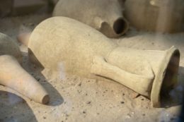 Die dickbauchigen bis etwa 1,5 Meter hohen Gefäße enthielten früher Öl, die mit den langen, schmalen Hälsen Wein und die dritte Form war typisch für die Fischsauce „Garum, Oberbegriff für Würzmittel auf der Basis von fermentiertem Fisch. Man könnte sagen, eine Art „antikes Maggi“, unverzichtbar in der römischen Küche.