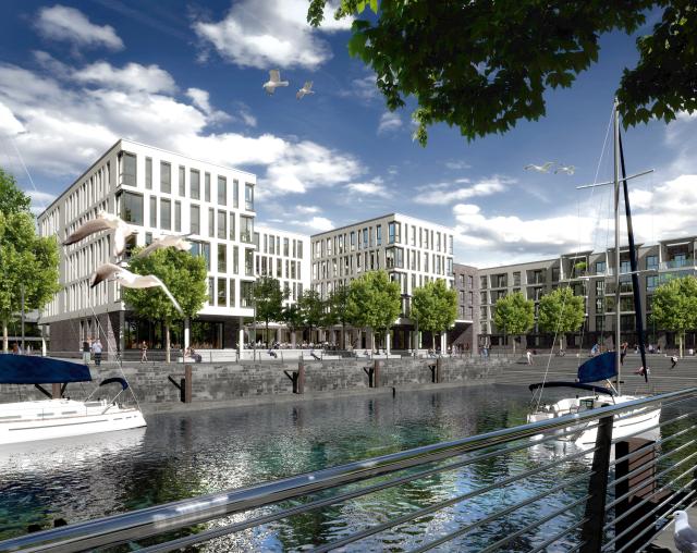 OB Ebling ist sich „Zündstoff sicher“, dabei hat er selbst zugestimmt. Das Ensemble „Rheinalle II“ wird von der saarländischen SBT Immobilien Gruppe gebaut. Deren Grundstück umfasst ca. 16.000 qm und sieht einen Gebäuderriegel entlang der Rheinallee sowie fünf Punkthäuser am Hafenbecken vor. Insgesamt sind hier 140 bis 150 Wohneinheiten geplant. Der Wohnungsmix umfasst 1-Raum-Wohnungen bzw. Apartments mit ca. 30 qm bis hin zu 5-Raum-Wohnungen mit 130 qm Wohnfläche. Im Erdgeschoss ist eine gewerbliche Nutzung vorgesehen. Fertigstellung 2017.