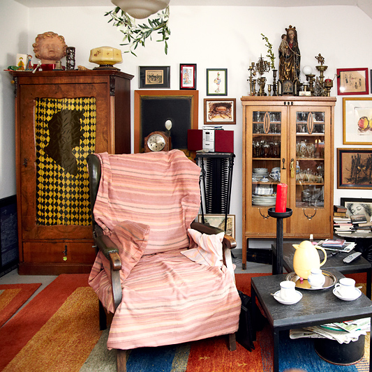 Mit dem Ansinnen, die Priesterlaufbahn einzuschlagen, ging der 22-jährige Ludwigmaria auf das Ketteler-Kolleg nach Mainz. Ein Ordensmann wurde er nicht, dafür aber 33 Jahre lang Verwaltungsgeschäftsführer des Ketteler-Wohnheims im Münchfeld, wo er auch eine Wohnung bezog. Nach dessen Schließung 2001 bot ihm die Kirche den Posten des persönlichen Urkundenschreibers von Kardinal Lehmann an. Abgegeben und verkauft – der Umzug vom Hartenberg in das kleinere Innenstadtdomizil dezimierte seine Sammelobjekte so notgedrungen um ein gutes Drittel. Dennoch bleibt ein beträchtlicher Rest erhalten: allerlei sakrales Gut und geschichtsträchtiges Mobiliar, alte Uhren – groß und klein, viele Bilder und Bücher. Wir blicken uns um und finden immer wieder neue Details, wähnen uns in einem Antiquariat. Für den 67-Jährigen jedoch keine reine Dekoration, er benutzt viele Gegenstände im täglichen Gebrauch: So beherbergt der hölzerne Uhrenkasten in der Küche allerlei Gewürze und gesammelte Klavierhocker dienen als Beistelltisch oder vor dem Grammophonschrank als höhenverstellbarer Hocker. Neben Telefon und Fernseher finden sich in der Wohnung nur sehr wenige Geräte der Morderne.