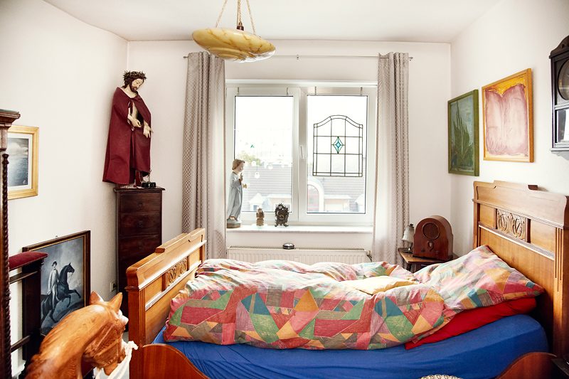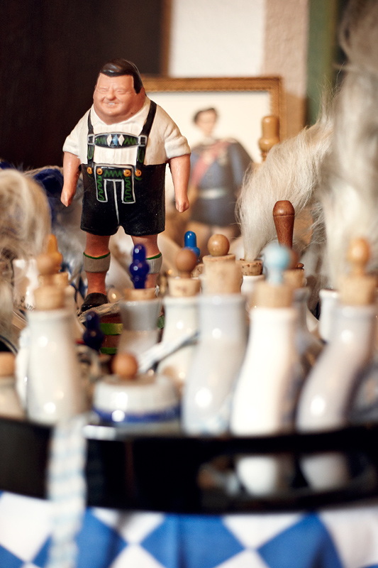 An der anderen Wand dagegen ein Stück gelebte Religion: den aus der Haushaltsauflösung des 1988 verstorbenen Kardinal Volk stammenden Betschemel hatte Bickel tatsächlich in Gebrauch, doch inzwischen möchte er ihm sein Gewicht nicht mehr zumuten, lacht er. Heutzutage gibt die Kirche ihre religiösen Gegenstände nicht mehr so schnell her, man möchte Platzierungen an inopportunen Orten vermeiden. In Kirche und Kunst kundig tritt Ludwigmaria seinen Reliquien – wenn auch manchmal mit einer kleinen Schippe Humor – mit gebührendem Respekt entgegen. Er erzählt ihre Geschichte und sie werden dadurch ein wenig lebendiger. Nur eine Frage der Zeit, für diese Wohnung voller Kostbarkeiten aus unterschiedlichen Epochen und den in Kirche, Kunst und Geschichte kundigen Erzähler – Danggsche und Pfia God! (das war bayrisch).