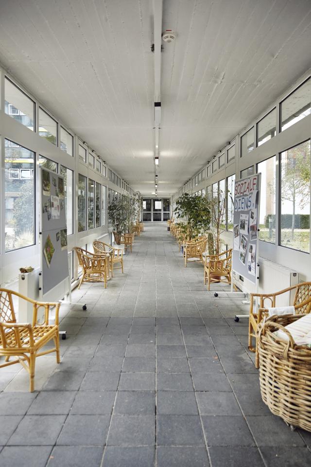 Ein wenig altmodisch und aus der Zeit gefallen wirkt es schon, das städtische Altenheim. Fast wie bei Oma zu Hause. In der Eingangshalle der Eindruck, ein 50er-Jahre Hotelfoyer zu betreten. Eine großzügige Sitzgruppe lädt zum Plauschen ein. Die offene Treppe führt in die erste Etage, ein gläserner Wandelgang zum „Gartenbau“ quer durch den Park. Wäre nicht die große Infowand mit Veranstaltungen und Hinweisen, käme man kaum auf die Idee, in einem Alten- und Pflegeheim zu sein.