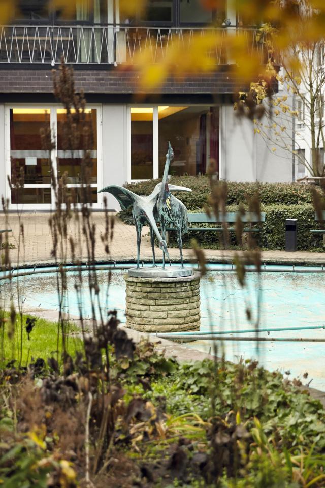 Hinter der Quintinskirche gibt es einen Zugang zum Kleinen Quintinsgässchen und dem „Flehlappe“, eigentlich „Weinhaus Quintin“, einem der ältesten Weinlokale und Stammkneipe von etlichen älteren Herrschaften. Die großen Fenster des Speisesaals, nachmittags auch als Cafeteria genutzt, blicken auf den Park hinaus, im Wasserbecken ist die Skulptur zweier Kraniche – so etwas wie das Wahrzeichen des Heims. Auf der anderen Seite der Gartenanlage, im großen Hühnergehege, leben ein Hahn und seine Hennen.