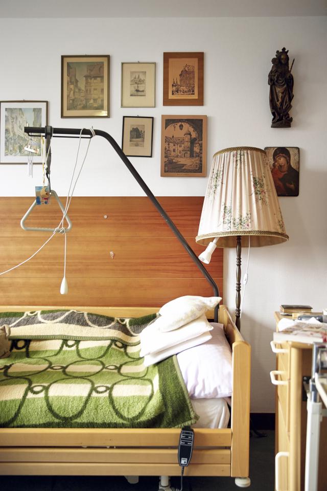 Annlis Seligmann lebt seit 2012 im 6. Stock des Hauptgebäudes. Die alte Dame bewohnt ein Einzelzimmer, vom Fenster geht der Blick über den Park und die Dächer des Geschäftsviertels. „Hier sitze ich oft und schaue“, erzählt sie. Das Zimmer ist geräumig, doch viel Platz ist trotzdem nicht: ein Bett, ein Tisch, ein Stuhl, ein Schrank. Die Zimmermitte muss frei bleiben, um ihrem Rollstuhl die nötige Bewegungsfreiheit zu lassen.