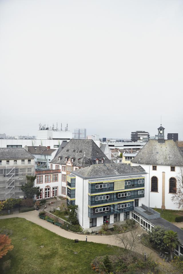 Das Mainzer Altenheim liegt im Zentrum der Stadt und bildet dennoch ein stilles Refugium für seine Bewohner. Es ist das letzte große städtischen Alternheim seiner Art. Heimleiter und Geschäftsführer ist Oliver Backhaus: „Hier, in zentraler Lage, leben die Menschen, die Mainz nach dem Krieg wieder aufgebaut haben. Wir wollen, dass es ihnen gut geht und sie sich hier wohlfühlen.“ Für 230 Bewohner stehen 146 Einzelzimmer und 42 Doppelzimmer zur Verfügung. Vom Park aus führt ein Tor zur Schusterstraße, unweit vom Markt.