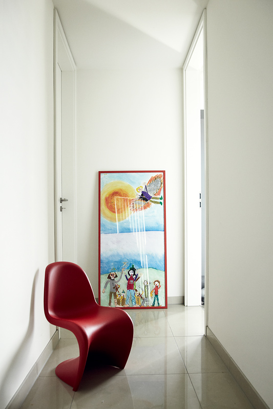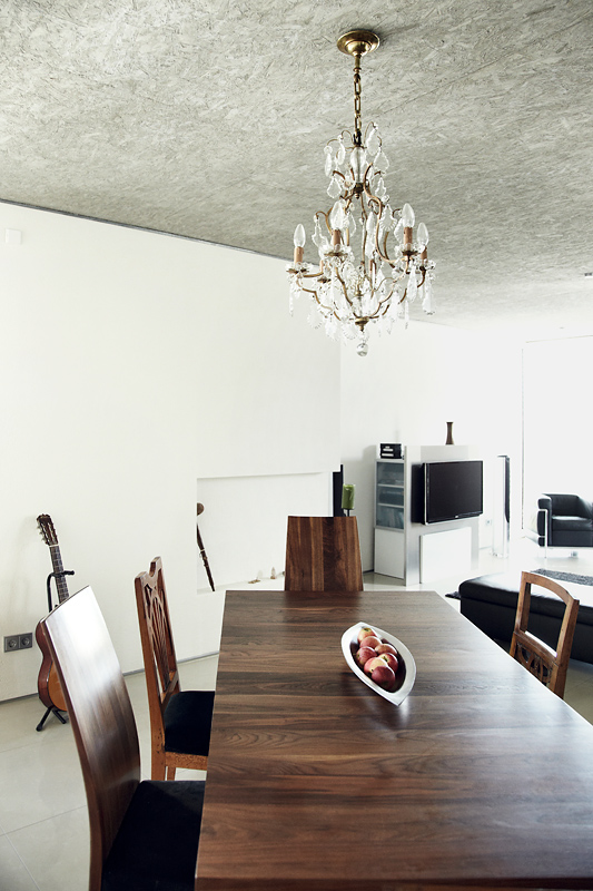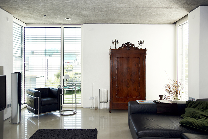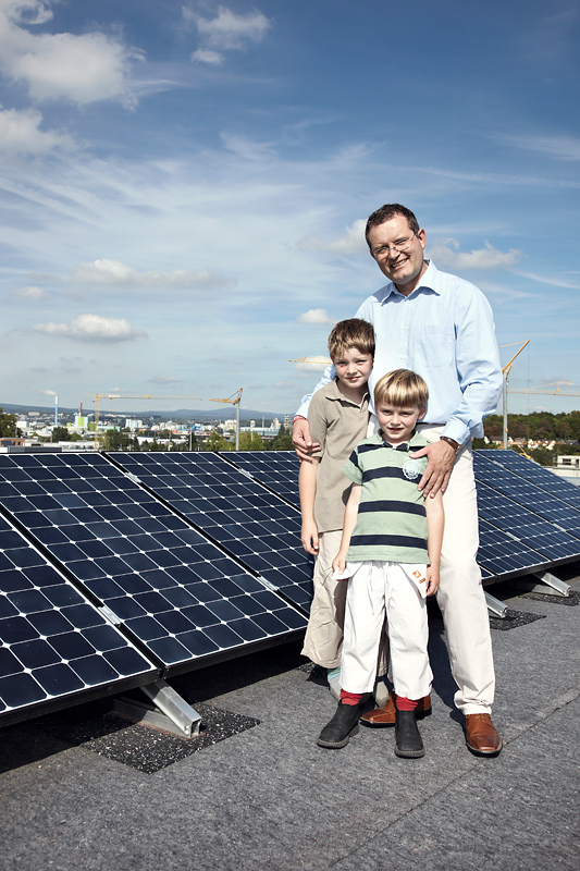 Seit Februar 2011 wohnt Familie Neises in ihrem neuen Heim. Ebenerdig lädt ein großzügiger, lichtdurchfluteter Wohn- und Essbereich zum Wohlfühlen ein. Die geschmackvollen Mitbringsel aus fernen Ländern – Marion Neises arbeitete als Wirtschaftsjournalistin im Ausland – kontrastieren hervorragend mit den klaren Linien im Innenausbau. Einziges Relikt aus einer energetisch alten Zeit ist der auf dem Flohmarkt erstandene Kristalllüster über dem Esstisch. Auf dem schwarzen Klavier vor der polierten grauen Betonwand üben nicht nur die beiden Söhne Maximilian und Cassian, sondern manchmal auch der Vater – wenn er Zeit und Ruhe findet. „Im offenen Wohnkonzept macht man deutlich mehr mit den Kindern zusammen“, stellt Marion Neises fest. „Sie helfen gerne beim Kochen und schnipseln Gemüse klein.“ Aber: Ist die Sonne untergegangen, bedeutet Stromverbrauch den Bezug aus dem Netz. So achtet die Familie bei der Nutzung von Spül- und Waschmaschine auf Tagesbetrieb. Konsequent weitergedacht: Auf Elektrogeräte der Energieeffizienzklasse vom Typ A/A+ legen sie Wert und trafen gemeinsam die Entscheidung gegen ein stromfressendes Gefrierfach. „Eine Umstellung war es schon, aber es funktioniert“, stellt Marion Neises fest.