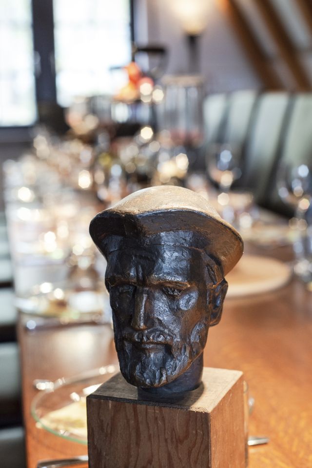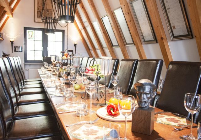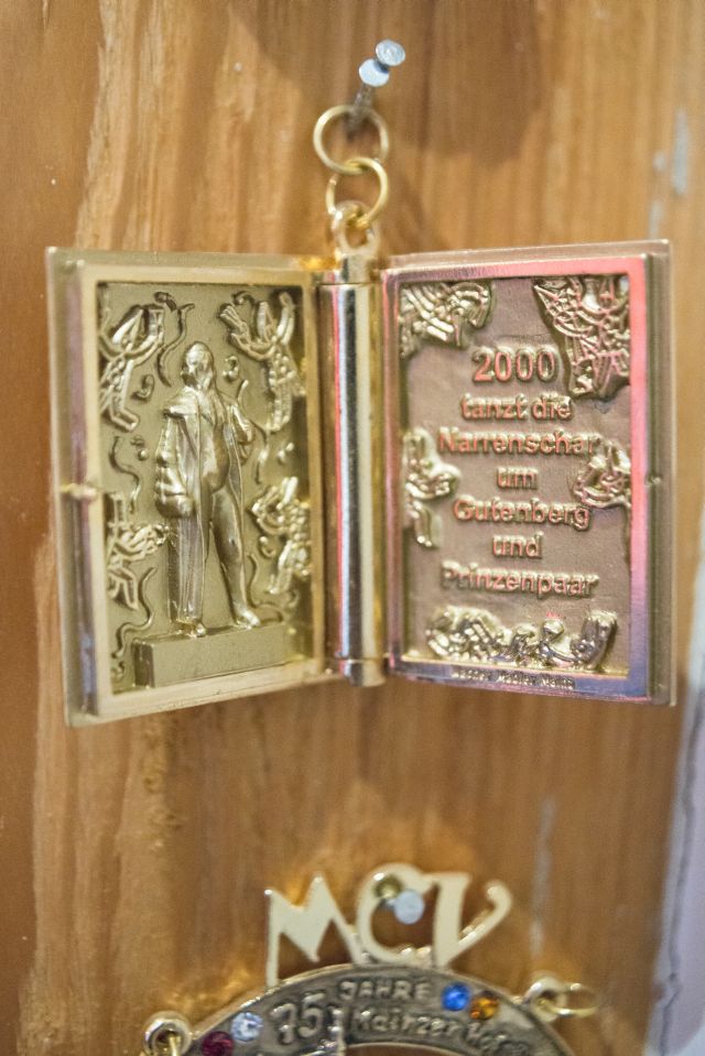 Treibt man sich zwischen Höfchen und Brand in der Innenstadt umher, wird man zumeist von der Menschenmenge getrieben und läuft vermutlich am Juwelier Wagner-Madler vorbei. Bei genauem betrachten des Hauses sieht man ein wenig, was das Innere verspricht: auf jeden Fall ist es alt. Doch tatsächlich analog zum Juwelier ein echtes Juwel, dass sich hier versteckt: ein kleiner Mainzer Geheimtipp im dritten Stock, den bisher oft nur die hohen Herren der Fastnacht auf ihren Ratssitzungen zu sehen bekamen. Der Senior-Juwelier und Ex-Präsident des Mainzer Carneval Vereins (MCV) Richard Wagner hat hier einen Ritter der Tafelrunde-Festsaal eingerichtet, in dem er gelegentlich zu rauschenden Soirées einlädt. Eine Wendeltreppe geht es hoch, dann begrüßt einen der Raum: länglich und schmal, die Tafel in seiner Mitte füllt ihn gut aus. Viel Holz offenbart sich: massive Balken stützen das spitz zulaufende Dach. Parkettboden veredelt die Atmosphäre und natürlich der zentrale Tisch, an den etwa 20 Gäste passen. Dazu strotzt der Raum vor Details: Die Wände sind von Sammlerstücken gesäumt, welche Richard Wagner überall auf der Welt erworben hat: Masken aus Venedig, Schmelztiegel, Beleuchtungen aus der Champagne, Bembel-Krüge und natürlich Fastnachtsorden en masse. Das Entdecken von schönen Dingen ist eine Leidenschaft des Juweliers, wen wundert es. Auch die eigentümlichen Kronleuchter, die an massiven Stahlketten von der Decke baumeln, stechen hier ins Auge: Es handelt sich um umgebaute Feuerkörbe. Und hinter dem Kopfende von „Gutenbergs Tafelrunde“ hat man – wie sollte es anders sein – einen tollen Blick auf den Mainzer Dom.